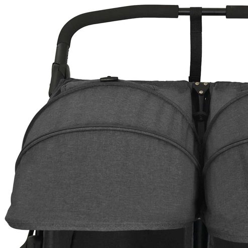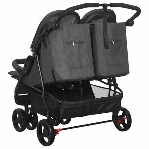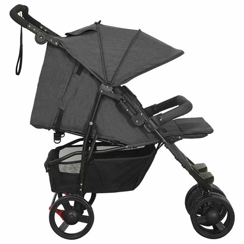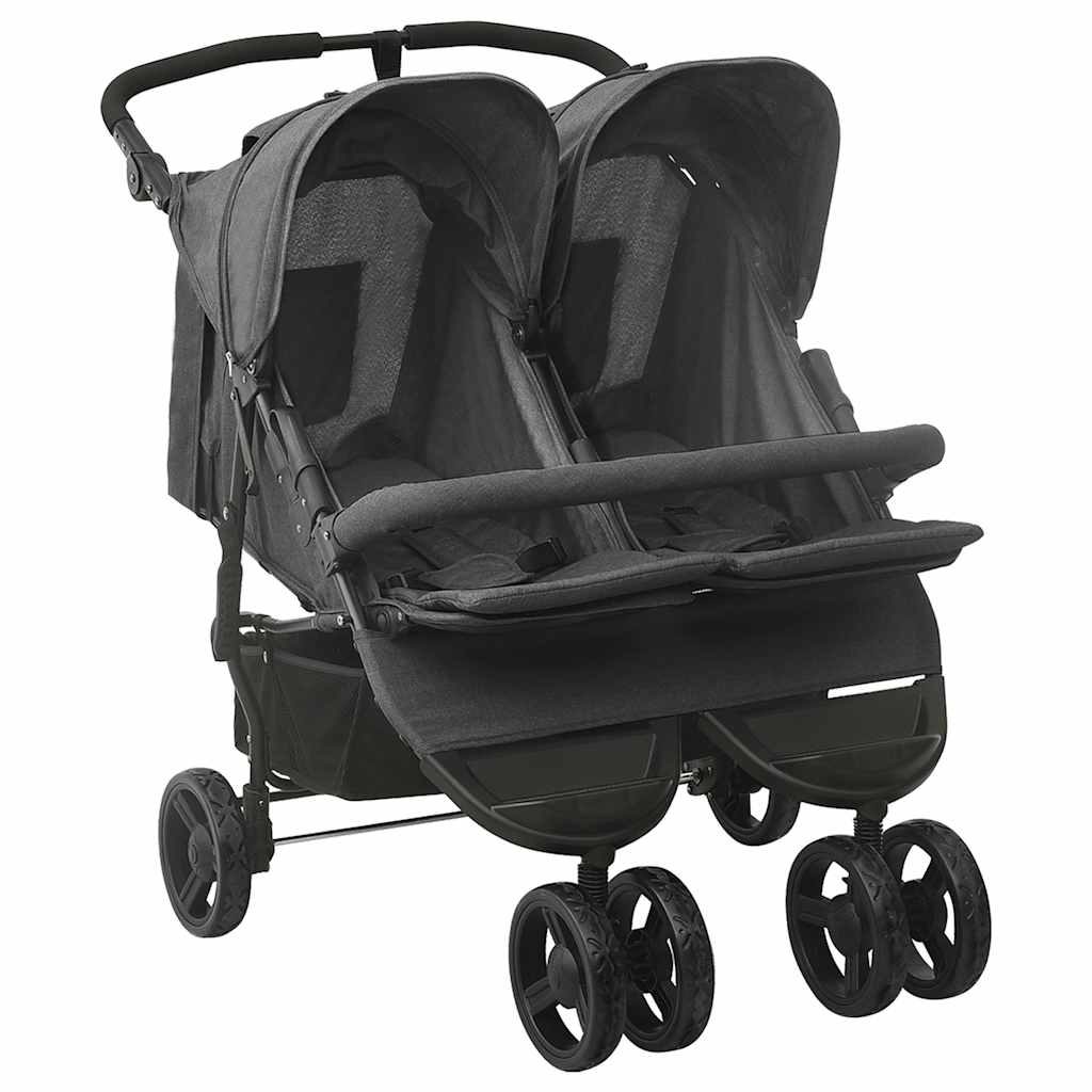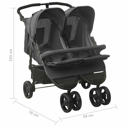 Mit diesem praktischen Zwillingswagen können Sie Ihre Kinder zum Spaziergang im Park, zum Einkaufen usw. mitnehmen. Der Kinderwagen für 2 Kinder verfügt über einen Stahlrahmen, der ihn robust und langlebig macht. Die Rückenlehne und die Fußstütze sind in mehreren Positionen verstellbar und bieten so hohen Komfort. Das runde Verdeck schützt Ihre Kinder vor direkter Sonneneinstrahlung. Darüber hinaus bietet die vordere Stoßstange optimale Sicherheit und verhindert das Herausfallen. Der mitgelieferte praktische Korb eignet sich ideal zur Aufbewahrung von Babyartikeln. Dieser Zwillingsbuggy lässt sich auch zusammenklappen, um eine einfache Lagerung und Transport zu gewährleisten. ** Farbe: Anthrazit ** Material: Stahl, Leinenstoff ** Abmessungen (aufgeklappt): 99 x 78 x 103 cm (B x T x H) ** Abmessungen (zusammengeklappt): 80 x 79 x 45 cm (B x T x H) ** Zusammenklappbar ** Verstellbarer Lenker ** Mit rundem Verdeck ** Mit Frontstoßstange ** Rückenlehne in mehrere Positionen verstellbar ** Verstellbare Fußstütze ** Mit Korb ** Max Belastbarkeit: 15 kg ** Zusammenbau erforderlich: Ja WARNUNG Lassen Sie Ihr Kind nie unbeaufsichtigt. Immer die Sicherheitsgurte benutzen. Dieses Produkt eignet sich nicht zum Laufen oder Skaten. Warnung. Dieses Produkt ist nicht zum Laufen oder Skaten geeignet. WARNUNG. Lass das Kind niemals unbeaufsichtigt. GPSR