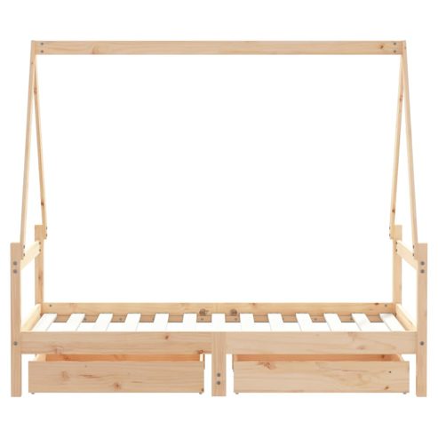 Mit diesem fantastischen Kinderbett aus Holz bietest du deinen Kleinen einen eigenen lustigen Platz! Massives Kiefernholz: Das Kinderbett ist aus massivem Kiefernholz gefertigt. Massives Kiefernholz ist ein wunderschönes Naturmaterial. Kiefernholz weist eine gerade Maserung auf und die Aststellen verleihen dem Material seine charakteristische, rustikale Optik.Robuste Latten: Das Kinderbett ist mit Holzlatten versehen, die für einen festen Halt, Belüftung und Stabilität sorgen.Design in Hausform: Dieses Kleinkinderbett weist ein durchdachtes Design mit einem Rahmen in Hausform auf, an dem du Bettvorhänge aufhängen kannst, um Privatsphäre für dein Kind zu schaffen.Mit Schubladen: Die mitgelieferten Schubladen bieten reichlich Platz für die Aufbewahrung von Kleinspielzeug, Kleidung und Bettzeug, um für Ordnung im Kinderzimmer zu sorgen.Durchdachtes Design: Dank der geringen Höhe des Einzelbettes können Kinder leicht ins Bett ein- und aussteigen. ** Material: Massives Kiefernholz (unbehandelt) ** Gesamtabmessungen: 165,5 x 85,5 x 143 cm (L x B x H) ** Geeignete Matratzengröße: 80 x 160 cm (B x L) (Matratze nicht im Lieferumfang enthalten) ** Abmessungen der Schubladen (pro Stück): 70 x 51 x 12,5 cm (B x T x H) ** Geeignet für Kinder ab 4 Jahren ** Zusammenbau erforderlich: Ja WARNUNG! Stelle dieses Kinderbett nicht in der Nähe von Wärmequellen, Fenstern und anderen Möbeln auf. WARNUNG! Benutze dieses Kinderbett nicht, wenn ein Teil kaputt ist, gerissen ist oder fehlt.