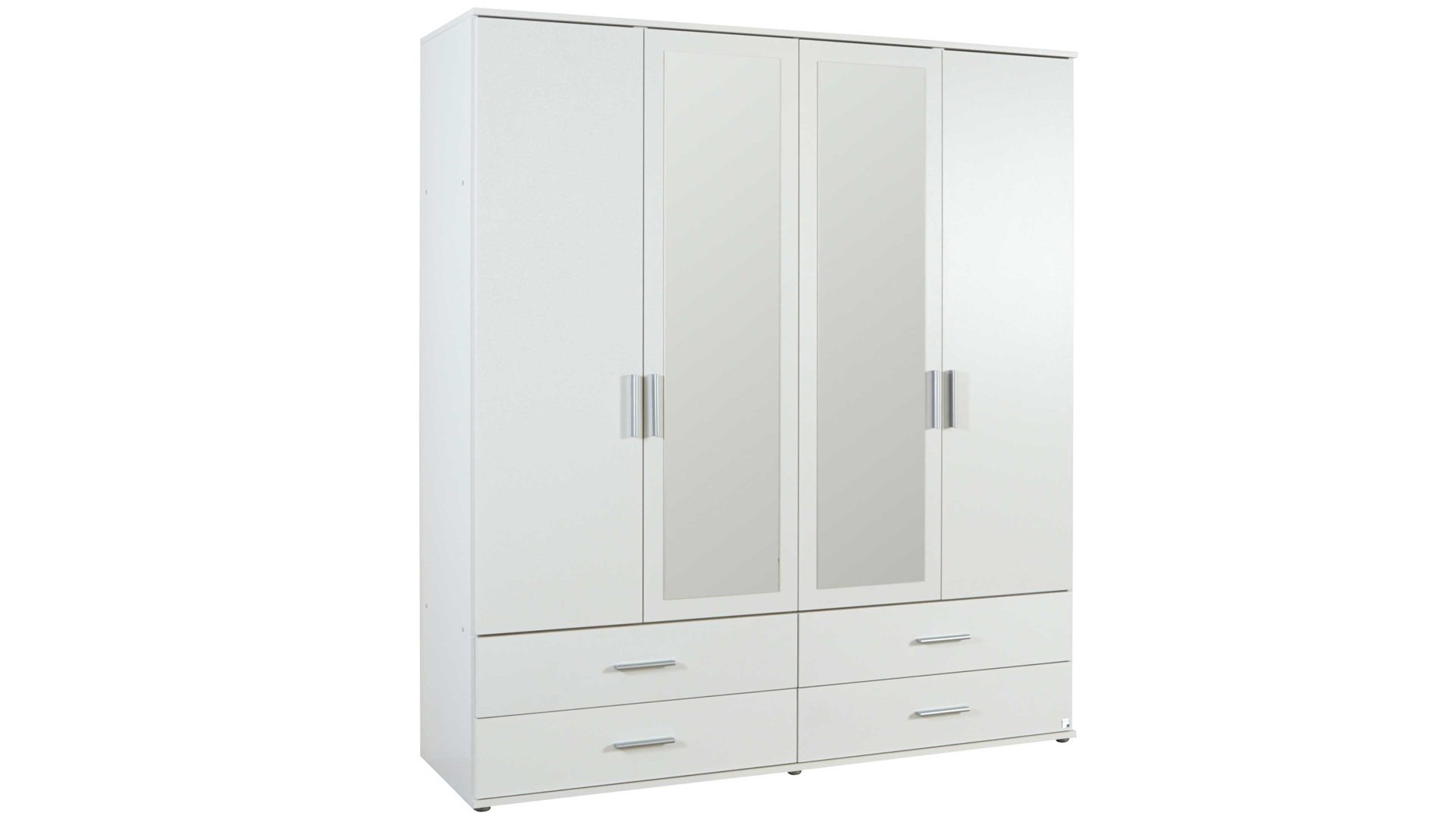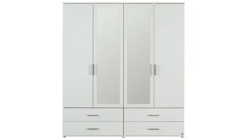 Denn der großzügige Kombi-Kleiderschrank hat zwei Holz- und zwei Spiegeltüren. Hier verstauen Sie auf drei Böden und an einer Kleiderstange bequem und ordentlich Ihre T-Shirts, Kleider und Hosen. Nutzen Sie die vier Schubladen für Ihre Socken oder Mützen. Insgesamt hat dieses zeitlose Schlafzimmermöbel oder Garderobenmöbel die praktischen Maße von ca. 168 x 188 x 52 cm (BxHxT). Weitere Größen sind mit der Produktnummer 698201 lieferbar.