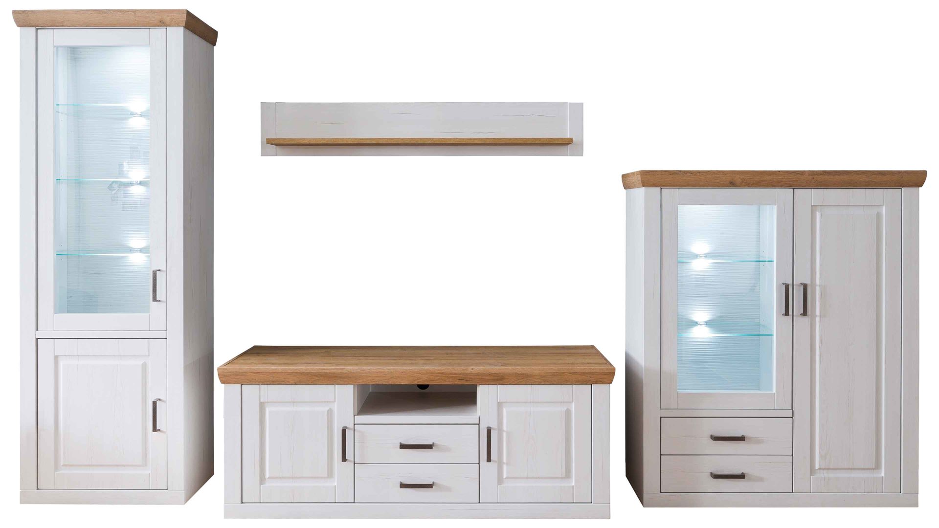 Bei der Wohnwand 01 aus dem Wohnprogramm Brixen begeistern sowohl die optischen als auch die funktionalen Merkmale. Sie kombiniert Pinie Aurelio-Nachbildung mit Grandson Oak-Nachbildung. Durch die Farben und die spezielle Frontgestaltung erscheinen die Wohnmöbel im angesagten skandinavischen Landhausstil. Geschroppte Rückwände, die ebenfalls in Pinie Aurelio-Nachbildung gehalten sind, sorgen zusammen mit den Klarglaseinsätzen für weitere herausragende Akzente. Klassische Metallgriffe runden das ausdrucksstarke Design stilvoll ab.