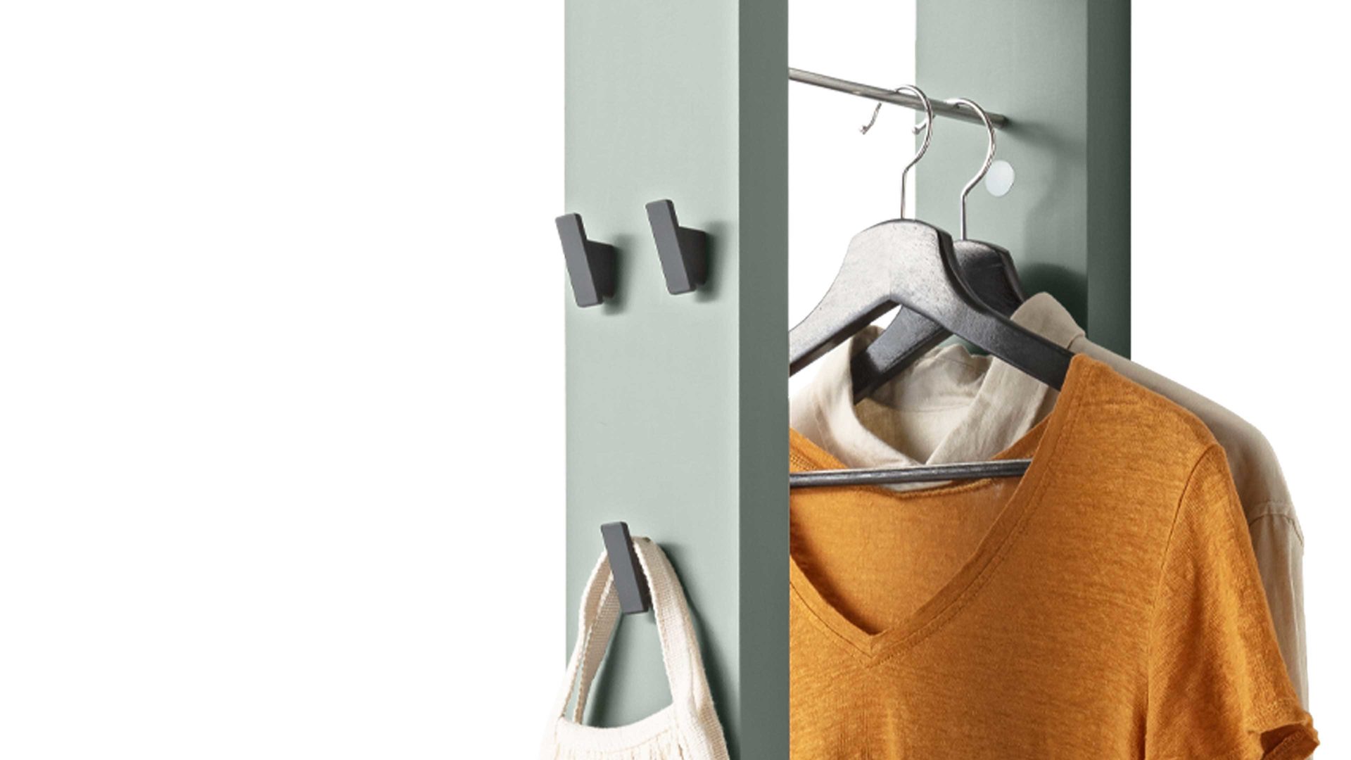 Auf der Kleiderstange und den drei Garderobenhaken können Sie Jacken, Mäntel und andere Kleidung, aber auch nützliche Utensilien wie Schlüssel oder Schirme aufhängen. Darüber hinaus bieten der obere und der untere Boden etwas Platz für kleinere Gegenstände. Die Maße des stabilen Garderobenpaneels betragen ca. 13 x 172 x 32 cm (BxHxT).