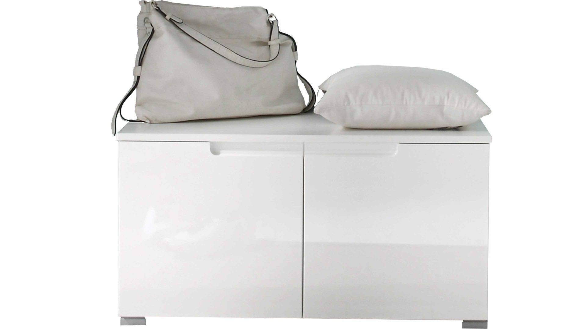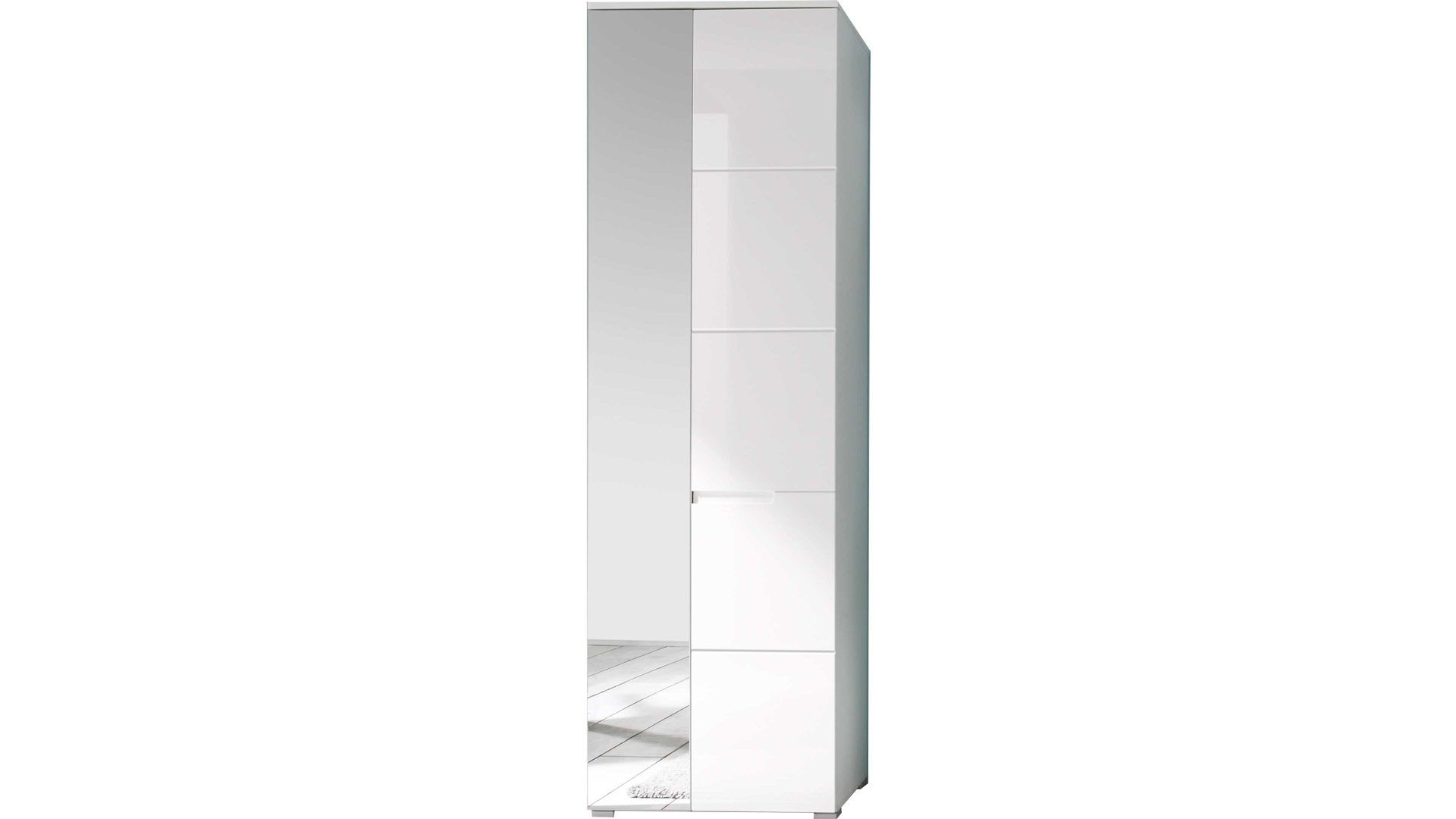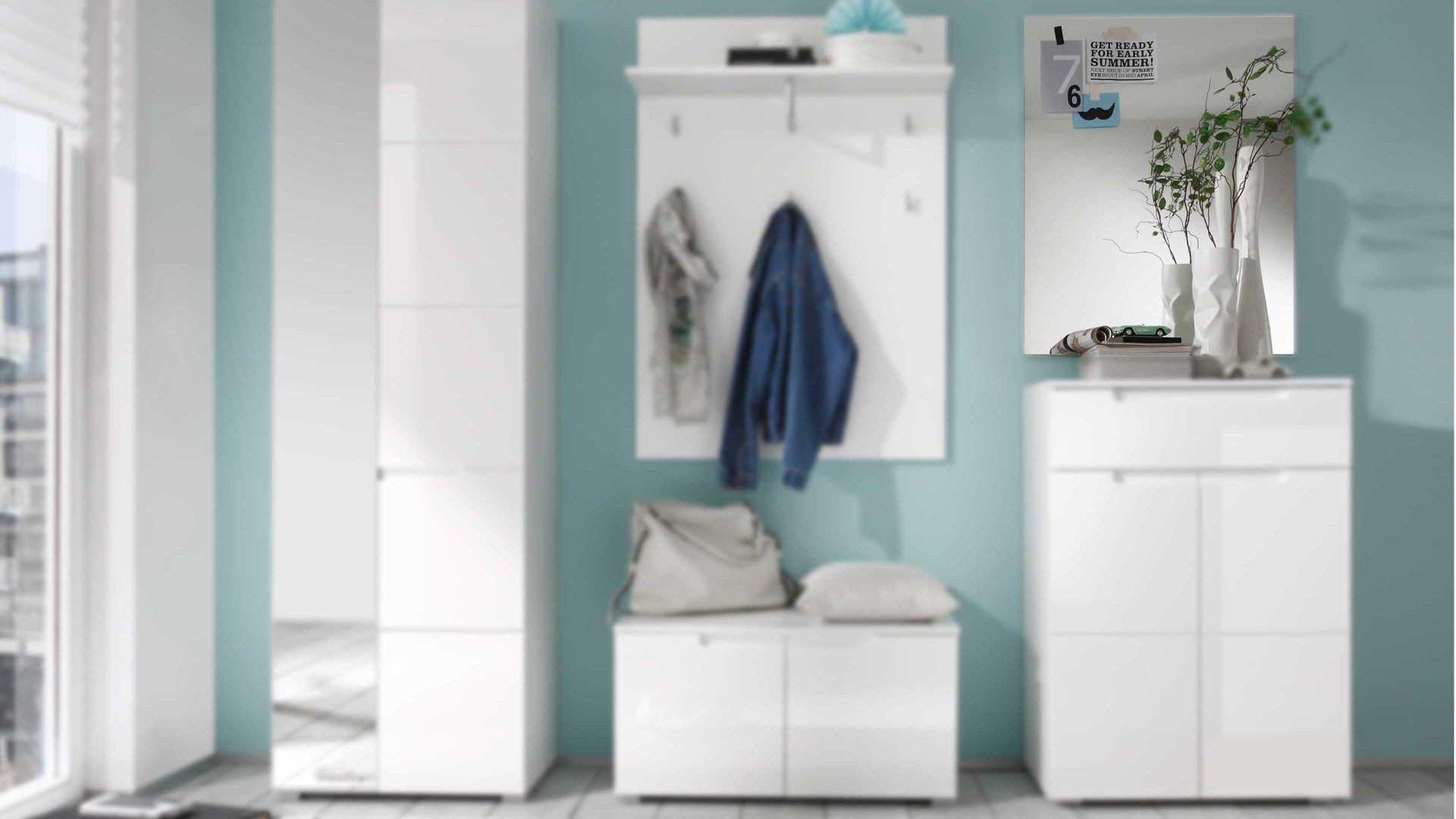 Das fünfteilige Garderoben-Set Spice setzt sich aus einem Garderobenschrank, einer Wandgarderobe, einer Garderobenbank, einer Schuhkommode und einem Wandspiegel zusammen. Alle Flurmöbel zeichnen sich durch ihren weißen Korpus und die eleganten Hochglanzfronten aus. Dank der klassischen, hellen Farbgebung erscheint die Garderobe überaus freundlich und einladend. Eine ausdrucksstarke Besonderheit ist überdies die grifflose Gestaltung der Fronten.