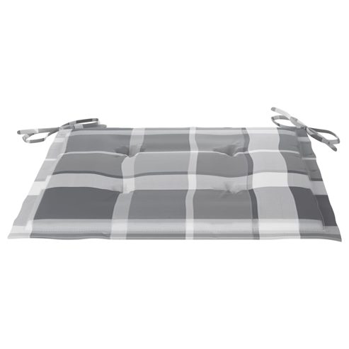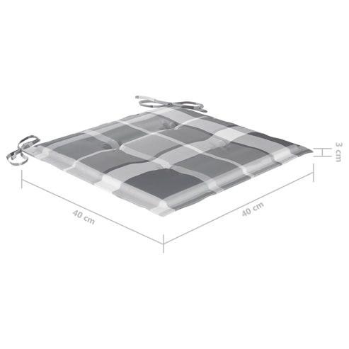 Dieses Gartenstuhl-Set aus Holz zeichnet sich durch ein zeitloses Design aus. Dank ihres schlichten und zugleich stilvollen Designs passen die Gartenstühle zu jeder Einrichtung, sei es Wohnungen, Büros, Bars oder Cafés. Das für dieses Möbelset verwendete Teakholz ist technisch getrocknet und anschließend fein geschliffen worden, um ein sehr glattes Erscheinungsbild zu eralten. Teakholz ist für seine außergewöhnliche Festigkeit und Witterungsbeständigkeit geschätzt und eignet sich daher besser für Gartenmöbel als jede andere Holzart. Teakholz ist die perfekte Wahl, wenn Sie ein langlebiges Gartenmöbel erwerben möchten. Dank der geschliffenen Oberfläche sind die Essstühle witterungsbeständig und leicht zu reinigen. Sie können auch zusammengeklappt werden, um bei Nichtgebrauch Stauraum zu sparen. Darüber hinaus sorgen die mitgelieferten Kissen für zusätzlichen Komfort. Jedes Kissen ist mit je 2 Bändern an zwei Ecken zur festen Befestigung am Stuhl versehen. Hinweis: Um die Lebensdauer Ihrer Gartenmöbel zu verlängern, empfehlen wir Ihnen, diese regelmäßig zu reinigen und bei Nichtgebrauch im Freien abzudecken.Reinigung: Verwenden Sie eine milde SeifenlösungLagerung: Wenn möglich, an einem kühlen, trockenen Ort im Innenbereich lagern. Wenn das Produkt im Freien gelagert wird, schützen Sie es mit einer wasserdichten Abdeckung. Wischen und trocknen Sie das überschüssige Wasser oder den Schnee nach Regen oder Schneefall von der ebenen Fläche. Sorgen Sie für eine ausreichende Luftzirkulation, um feuchtigkeitsbedingte Schäden zu vermeiden. ** Stuhl-Material: Fein geschliffenes Teakholz mit Lasur auf Wasserbasis ** Kissen-Material: Stoff (100% Polyester) ** Stuhlmaße (aufgeklappt): 46,5 x 58 x 88 cm (B x T x H) ** Stuhlmaße (zusammengeklappt): 46,5 x 108 x 12 cm (B x T x H) ** Kissen-Maße: 40 x 40 x 3 cm (L x B x T) ** Sitzbreite: 46,5 cm ** Sitztiefe: 41,5 cm ** Sitzhöhe vom Boden: 46 cm ** Mit 2 Bänder-Sets ** Mit grauem Karomuster ** Zusammenklappbar ** Keine Montage nötig ** Lieferung enthält: ** 4 x Gartenstuhl ** 4 x Sitzkissen Maximal 110 kg pro Sitzplatz.