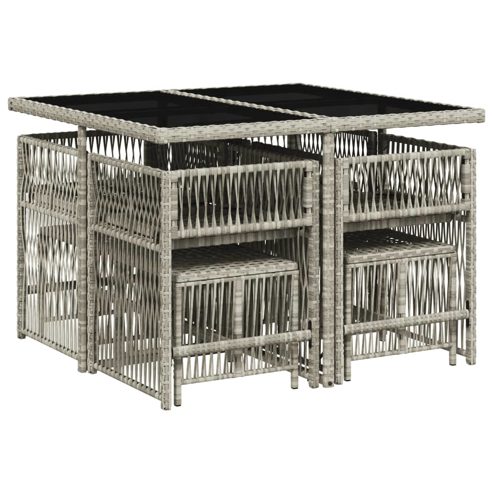 Diese Garten-Essgruppe ist eine ideale Wahl für Mahlzeiten im Freien oder einfach nur zum Entspannen im Garten, Hinterhof oder auf der Terrasse. Langlebiges Material: PE-Rattan, auch als Poly Rattan bekannt, ist ein robustes, pflegeleichtes synthetisches Material, das die Optik von natürlichem Rattan aufweist. Es kennzeichnet sich durch ein geringes Eigengewicht und lässt sich einfach reinigen. Aufgrund seiner Haltbarkeit und Witterungsbeständigkeit wird es häufig bei der Herstellung von Gartenmöbeln verwendet.Platzsparende Aufbewahrung: Dank der klappbaren Rückenlehnen lassen sich die Stühle unter dem Tisch verstauen, sodass die gesamte Essgruppe bei Nichtgebrauch eine platzsparende Würfelform bildet.Bequemes Sitzerlebnis: Dieser Gartensessel mit dick gepolsterten Kissen bietet ein angenehmes Sitzgefühl.Abnehmbarer und waschbarer Bezug: Die Sitzkissen verfügen über abnehmbare Bezüge, die sich ganz einfach waschen und reinigen lassen. Dank der Klappen an der Rückseite können die Kissen ganz einfach an den Rückenlehnen befestigt werden.Tischplatte aus Glas: Die Tischplatte des Gartentisches besteht aus starkem und langlebigem Hartglas, sodass sie leicht mit einem feuchten Tuch gereinigt werden kann und deinem Außenbereich einen Hauch von Eleganz verleiht. Gut zu wissen:Wir empfehlen dir, deine Gartenmöbel mit einer wasserdichten Hülle zu schützen, um lange Zeit eine ansprechende Optik aufzuweisen. ** Maximale Tragfähigkeit (pro Sitz ): 110 kg ** UV-beständig ** Zusammenbau erforderlich: Ja ** Tisch: ** Farbe: Hellgrau ** Material: PE-Rattan, pulverbeschichteter Stahl, Hartglas ** Abmessungen: 110 x 106 x 73 cm (L x B x H) ** Stuhl: ** Farbe: Hellgrau ** Material: PE-Rattan, pulverbeschichteter Stahl ** Abmessungen: 50,5 x 54 x 79 cm (B x T x H) ** Sitzgröße: 45,5 x 38 cm (B x T) ** Sitzhöhe vom Boden: 43 cm ** Armlehnenhöhe vom Boden: 63,5 cm ** Hocker: ** Farbe: Hellgrau ** Material: PE-Rattan, pulverbeschichteter Stahl ** Abmessungen: 41 x 41 x 36 cm (B x T x H) ** Kissen: ** Farbe: Anthrazit ** Bezugsmaterial: Stoff (100% Polyester) ** Füllung: Schaumstoff ** Abmessungen des Sitzkissens: 76 x 46 x 2 cm (L x B x T) ** Abmessungen des Hockerkissens: 40 x 40 x 2 cm (B x T x H) ** Lieferung umfasst: ** 1 x Gartentisch ** 4 x Gartenstuhl ** 4 x Gartenhocker ** 4 x Hochlehnerauflage mit abnehmbarem und waschbarem Bezug ** 4 x Hocker-Kissen mit abnehmbarem und waschbarem Bezug