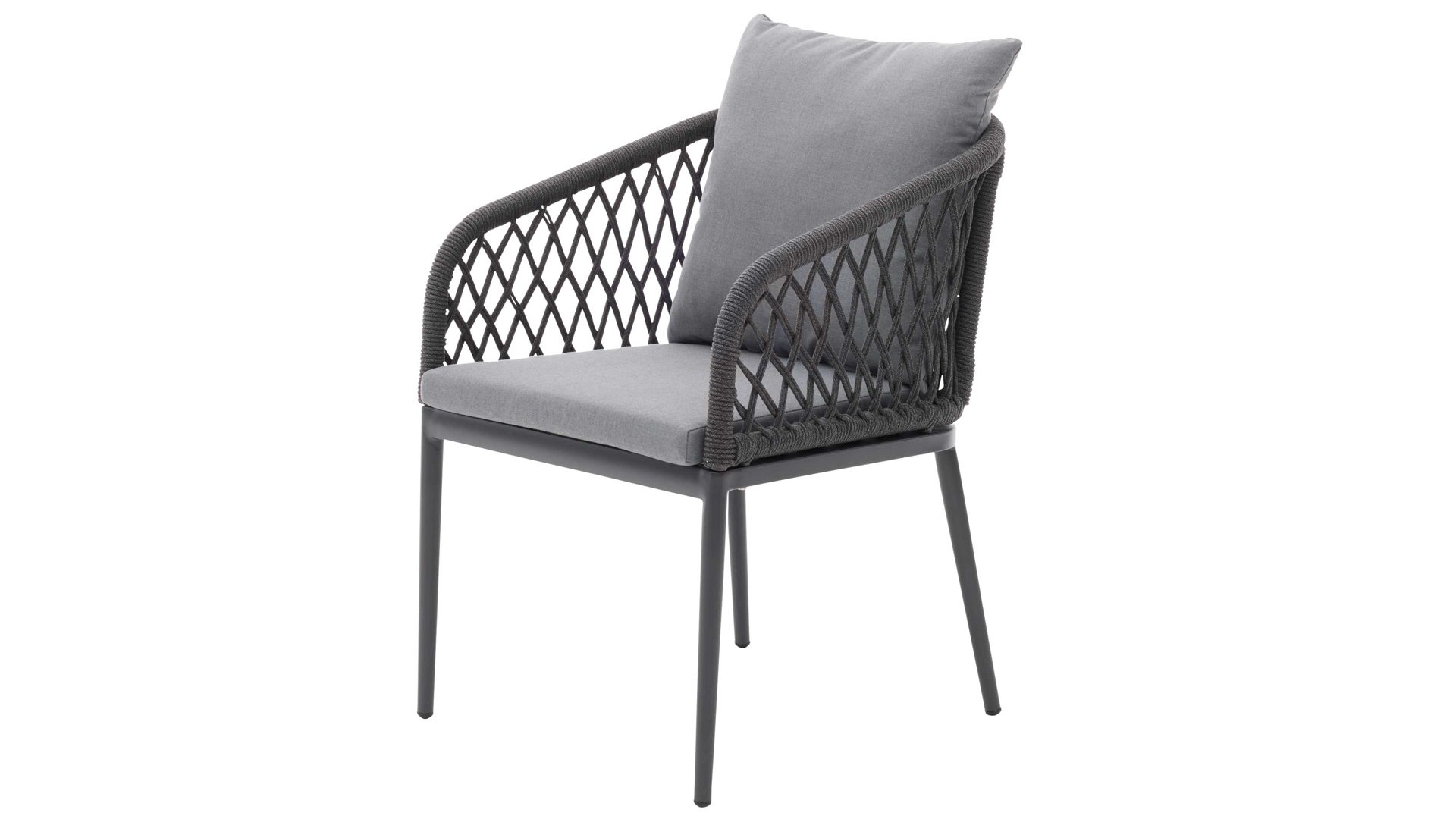 Dazu erhältst du vier Diningsessel, gestaltet mit grauem Kordelgeflecht in Rautenoptik und einem anthrazitfarben pulverbeschichteten Aluminiumgestell. Das Kordelmaterial besteht zu 100 % aus Polyester – witterungsbeständig, formstabil und strapazierfähig. Sitz- und Rückenkissen mit komfortabler PU-Schaumfüllung sowie die abnehmbaren dunkelgrauen Bezüge, die du bei 30 Grad waschen kannst, sorgen für ein bequemes Sitzgefühl. Mit ihren ca. 56 x 78 x 63 cm (BxHxT) und einer Sitzhöhe von ca. 47 cm bieten die Armlehnstühle ergonomischen Outdoor-Komfort. Praktisch für dich: Die Stühle werden fertig montiert geliefert.