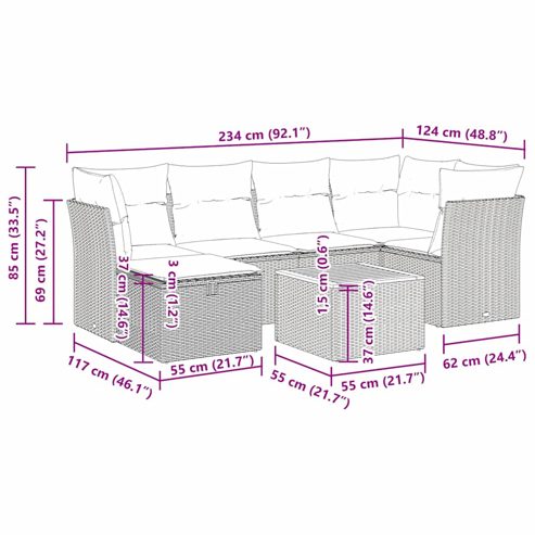 Diese Garten-Sofagarnitur ist die perfekte Ergänzung zu deinem Garten, deiner Terrasse oder deinem Innenhof. Sie bietet einen bequemen und einladenden Platz, um mit Familie und Freunden zu plaudern oder dich einfach nur zu entspannen und das Leben im Freien zu genießen. Langlebiges Material: PE-Rattan, auch als Poly Rattan bekannt, ist ein robustes, pflegeleichtes synthetisches Material, das die Optik von natürlichem Rattan aufweist. Es kennzeichnet sich durch ein geringes Eigengewicht und lässt sich einfach reinigen. Aufgrund seiner Haltbarkeit und Witterungsbeständigkeit wird es häufig bei der Herstellung von Gartenmöbeln verwendet.Stauraum mit wasserfestem Beutel: Jedes Gartensofa verfügt über ein Staufach unter der Sitzfläche, das mit einem wasserfesten Beutel zur Aufbewahrung von Kissen, Spielzeug und anderen Gegenständen versehen ist. Die Kissen sind mit Bezügen versehen und lassen sich mit Klettverschlüssen fest und sicher am Sofa befestigen.Vielseitiger Fußhocker: Der Hocker ist vielseitig einsetzbar und dient als bequeme Fußstütze beim Entspannen auf dem Sofa oder als zusätzlicher Sitzplatz in deinem Garten.Abnehmbarer und waschbarer Bezug: Diese Sitzkissen verfügen über abnehmbare Bezüge für einfaches Waschen und Pflegen.Robustes und stabiles Gestell: Der pulverbeschichtete Stahlgestell ist stark, stabil, langlebig sowie korrosions- und wetterbeständig, um eine lang anhaltende Leistung zu gewährleisten. Gut zu wissen:Wir empfehlen dir, deine Gartenmöbel mit einer wasserdichten Hülle zu schützen, um lange Zeit eine ansprechende Optik aufzuweisen. ** Abmessungen des wasserfesten Beutels: 55 x 53 x 34 cm (L x B x H) ** Maximale Tragfähigkeit (pro Sitz): 110 kg ** UV-beständig ** Verstellbare Füße aus Kunststoff ** Zusammenbau erforderlich: Ja ** Mittelsofa: ** Farbe: Schwarz ** Material: PE-Rattan, pulverbeschichteter Stahl ** Abmessungen: 55 x 62 x 69 cm (B x T x H) ** Sitzgröße: 55 x 55 cm (B x T) ** Sitzhöhe vom Boden (ohne Kissen): 37 cm ** Ecksofa: ** Farbe: Schwarz ** Material: PE-Rattan, pulverbeschichteter Stahl ** Abmessungen: 62 x 62 x 69 cm (B x T x H) ** Sitzgröße: 55 x 55 cm (B x T) ** Sitzhöhe vom Boden (ohne Kissen): 37 cm ** Sofa mit Armlehnen: ** Farbe: Schwarz ** Material: PE-Rattan, pulverbeschichteter Stahl ** Abmessungen: 65,5 x 62 x 69 cm (B x T x H) ** Sitzgröße: 55 x 55 cm (B x T) ** Sitzhöhe vom Boden (ohne Kissen): 37 cm ** Armlehnenhöhe vom Boden: 55 cm ** Breite der Armlehnen: 10 cm ** Tisch: ** Farbe: Schwarz und Braun ** Material: PE-Rattan, pulverbeschichteter Stahl, massives Akazienholz mit Ölfinish ** Abmessungen: 55 x 55 x 37 cm (L x B x H) ** Fußhocker: ** Farbe: Schwarz ** Material: PE-Rattan, pulverbeschichteter Stahl ** Abmessungen: 55 x 55 x 37 cm (B x T x H) ** Kissen: ** Farbe: Blau ** Bezugsmaterial: Stoff (100% Polyester) ** Füllmaterial des Sitzkissen: Schaumstoff ** Füllmaterial des Rückenkissens: Baumwollfaser ** Abmessungen des Sitzkissens: 55 x 55 x 3 cm (B x T x H) ** Abmessungen des Rückenkissens: 55 x 45 x 13 cm (L x B x T) ** Lieferung umfasst: ** 2 x Mittelsofa mit Stauraum und wasserfestem Beutel ** 3 x Ecksofa mit Stauraum und wasserfestem Beutel ** 1 x Tisch ** 1 x Fußhocker mit Stauraum ** 8 x Rückenkissen ** 6 x Sitzkissen mit abnehmbarem und waschbarem Bezug