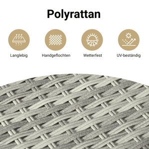 Genieße einen Kaffee oder unterhalte dich mit deiner Familie und deinen Freunden im Garten, Hinterhof oder auf dem Balkon mit diesem bequemen Bistro-Set! Langlebiges Material: PE-Rattan, auch als Poly Rattan bekannt, ist ein robustes, pflegeleichtes synthetisches Material, das die Optik von natürlichem Rattan aufweist. Es kennzeichnet sich durch ein geringes Eigengewicht und lässt sich einfach reinigen. Aufgrund seiner Haltbarkeit und Witterungsbeständigkeit wird es häufig bei der Herstellung von Gartenmöbeln verwendet.Verstellbare Rückenlehne und Fußstütze: Der Gartensessel ist mit einem Griff versehen. So kannst du die Rückenlehne und den Fußteil durch Ziehen des Griffs verstellen und sie danach schnell wieder in ihre ursprüngliche Position bringen. Bequemes Sitzerlebnis: Dieses Gartenmöbel-Set wird samt dick gepolsterten Kissen geliefert, um höchsten Sitzkomfort zu bieten.Abnehmbarer und waschbarer Bezug: Diese Sitzkissen verfügen über abnehmbare Bezüge für einfaches Waschen und Pflegen.Robuster und stabiler Rahmen: Dank des pulverbeschichteten Stahlrahmens ist das Möbelstück robust, stabil und für den täglichen Einsatz im Außenbereich geeignet. Gut zu wissen:Wir empfehlen dir, deine Gartenmöbel mit einer wasserdichten Hülle zu schützen, um lange Zeit eine ansprechende Optik aufzuweisen. ** UV-beständig ** Zusammenbau erforderlich: Ja ** Relaxsessel: ** Farbe: Hellgrau ** Material: PE-Rattan, pulverbeschichteter Stahl ** Abmessungen in Sitzposition: 57 x 66 x 93 cm (B x T x H) ** Abmessungen in Liegeposition: 57 x 117 x 83 cm (B x T x H) ** Sitzgröße: 48 x 54 cm (B x T) ** Sitzhöhe vom Boden: 43,5 cm ** Armlehnenhöhe vom Boden: 62 cm ** Maximale Tragfähigkeit (pro Sitz ): 110 kg ** Tisch: ** Farbe: Hellgrau ** Material: PE-Rattan, pulverbeschichteter Stahl ** Abmessungen: 45 x 50 cm (Durchmesser x H) ** Kissen: ** Farbe: Anthrazit ** Bezugsmaterial: Stoff (100% Polyester) ** Füllmaterial des Sitzkissen: Schaumstoff ** Füllmaterial des Rückenkissens: Baumwollfaser ** Abmessungen des Sitzkissens: 48 x 90 x 3 cm (B x T x H) ** Abmessungen des Rückenkissens: 48 x 67 x 11 cm (B x T x H) ** ** Lieferung umfasst: ** 2 x Verstellbarer Gartenstuhl ** 1 x Gartentisch ** 2 x Sitzkissen mit abnehmbarem und waschbarem Bezug ** 2 x Rückenkissen