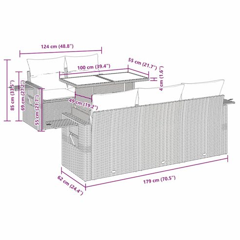 Diese Garten-Sofagarnitur ist die perfekte Ergänzung zu deinem Garten, deiner Terrasse oder deinem Innenhof. Sie bietet einen bequemen und einladenden Platz, um mit Familie und Freunden zu plaudern oder dich einfach nur zu entspannen und das Leben im Freien zu genießen.Langlebiges Material: PE-Rattan, auch als Poly Rattan bekannt, ist ein robustes, pflegeleichtes synthetisches Material, das die Optik von natürlichem Rattan aufweist. Es kennzeichnet sich durch ein geringes Eigengewicht und lässt sich einfach reinigen. Aufgrund seiner Haltbarkeit und Witterungsbeständigkeit wird es häufig bei der Herstellung von Gartenmöbeln verwendet.Stauraum mit wasserfestem Beutel: Jedes Gartensofa verfügt über ein Staufach unter der Sitzfläche, das mit einem wasserfesten Beutel zur Aufbewahrung von Kissen, Spielzeug und anderen Gegenständen versehen ist. Die Kissen sind mit Bezügen versehen und lassen sich mit Klettverschlüssen fest und sicher an den Sofas befestigen.Praktische Ablage: Dieses Gartensofa verfügt über eine klappbare Ablage mit Gasfeder, auf der du verschieden Sachen griffbereit aufbewahren kannst.Abnehmbarer und waschbarer Bezug: Diese Sitzkissen verfügen über abnehmbare Bezüge für einfaches Waschen und Pflegen.Modulares Design: Dank des modularen Designs lassen sich die Gartenmöbel völlig flexibel und einfach umstellen, um deinen Außenbereich ganz individuell zu gestalten.Gut zu wissen:Wir empfehlen dir, deine Gartenmöbel mit einer wasserdichten Hülle zu schützen, um lange Zeit eine ansprechende Optik aufzuweisen. ** Maximale Tragfähigkeit (pro Sitz ): 110 kg ** UV-beständig ** Verstellbare Füße aus Kunststoff ** Zusammenbau erforderlich: Ja ** Mittelsofa: ** Farbe: Schwarz ** Material: PE-Rattan, pulverbeschichteter Stahl ** Abmessungen: 55 x 62 x 69 cm (B x T x H) ** Sitzgröße: 55 x 55 cm (B x T) ** Sitzhöhe vom Boden (ohne Kissen): 37 cm ** Abmessungen des wasserfesten Beutels: 55 x 53 x 34 cm (L x B x H) ** Ecksofa mit Armlehne aus Rattan: ** Farbe: Schwarz ** Material: PE-Rattan, pulverbeschichteter Stahl ** Abmessungen: 62 x 62 x 69 cm (B x T x H) ** Sitzgröße: 55 x 55 cm (B x T) ** Sitzhöhe vom Boden (ohne Kissen): 37 cm ** Armlehnenhöhe vom Boden: 55 cm ** Armlehnenbreite: 6 cm ** Größe des Beistelltisches: 25 x 23 cm (L x B) ** Tisch: ** Farbe: Schwarz ** Material: PE-Rattan, pulverbeschichteter Stahl, Hartglas ** Abmessungen: 100 x 55 x 44/73 cm (L x B x H) ** Kissen: ** Farbe: Blau ** Bezugsmaterial: Stoff (100% Polyester) ** Füllmaterial des Sitzkissen: Schaumstoff ** Füllmaterial des Rückenkissens: Baumwollfaser ** Abmessungen des Sitzkissens: 55 x 55 x 3 cm (B x T x H) ** Abmessungen des Rückenkissens: 55 x 45 x 13 cm (L x B x T) ** Lieferung umfasst: ** 1 x Gartentisch ** 4 x Sofa-Eckelement mit Armlehne aus Rattan, Stauraum und wasserfestem Beutel ** 1 x Mittelsofa mit Stauraum und wasserfestem Beutel ** 5 x Sitzkissen mit abnehmbarem und waschbarem Bezug ** 5 x Rückenkissen