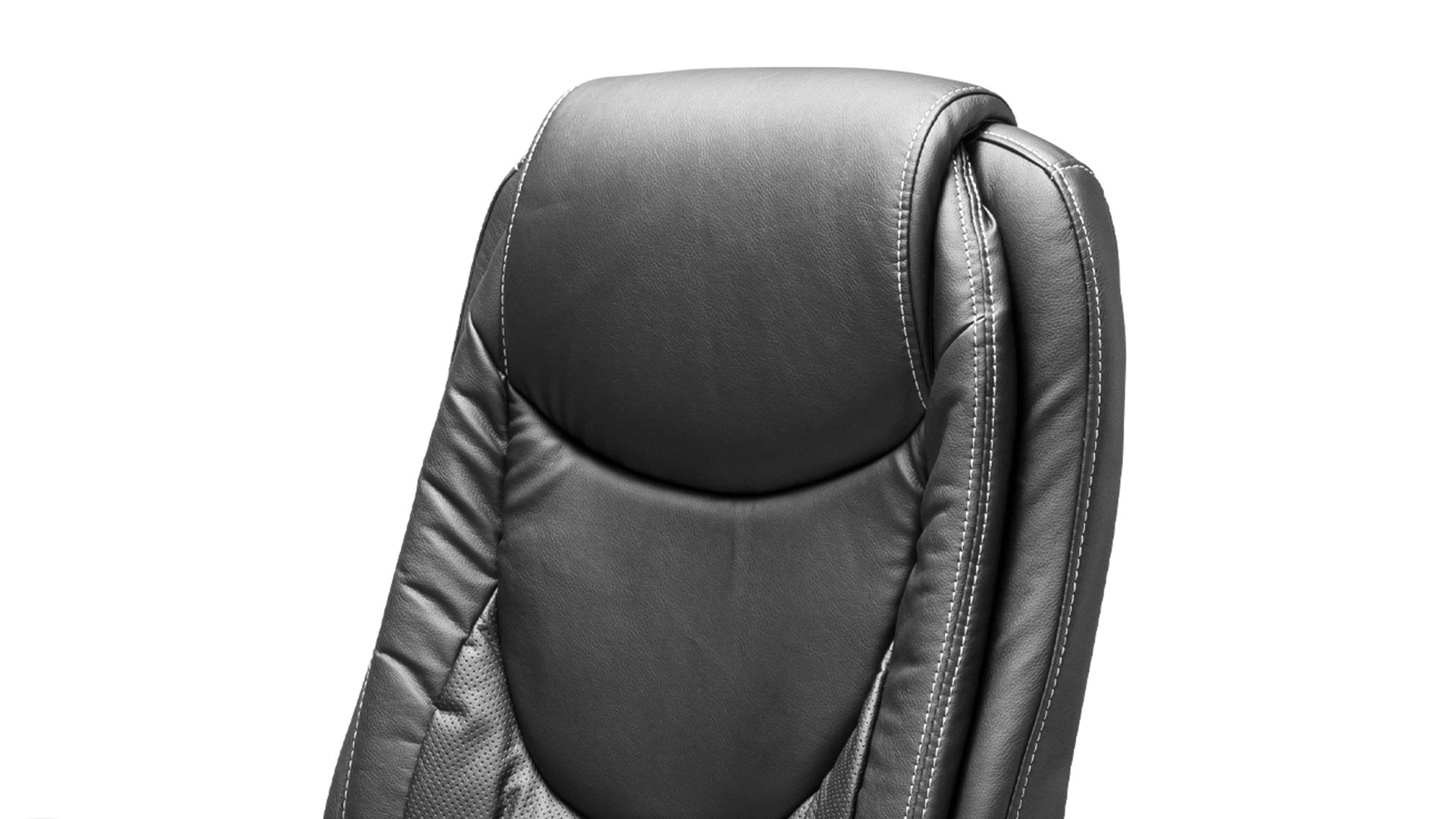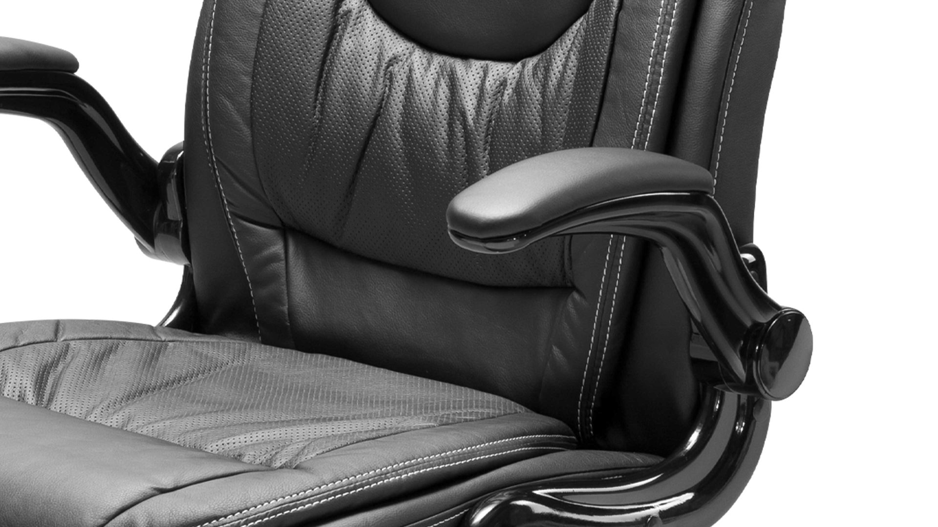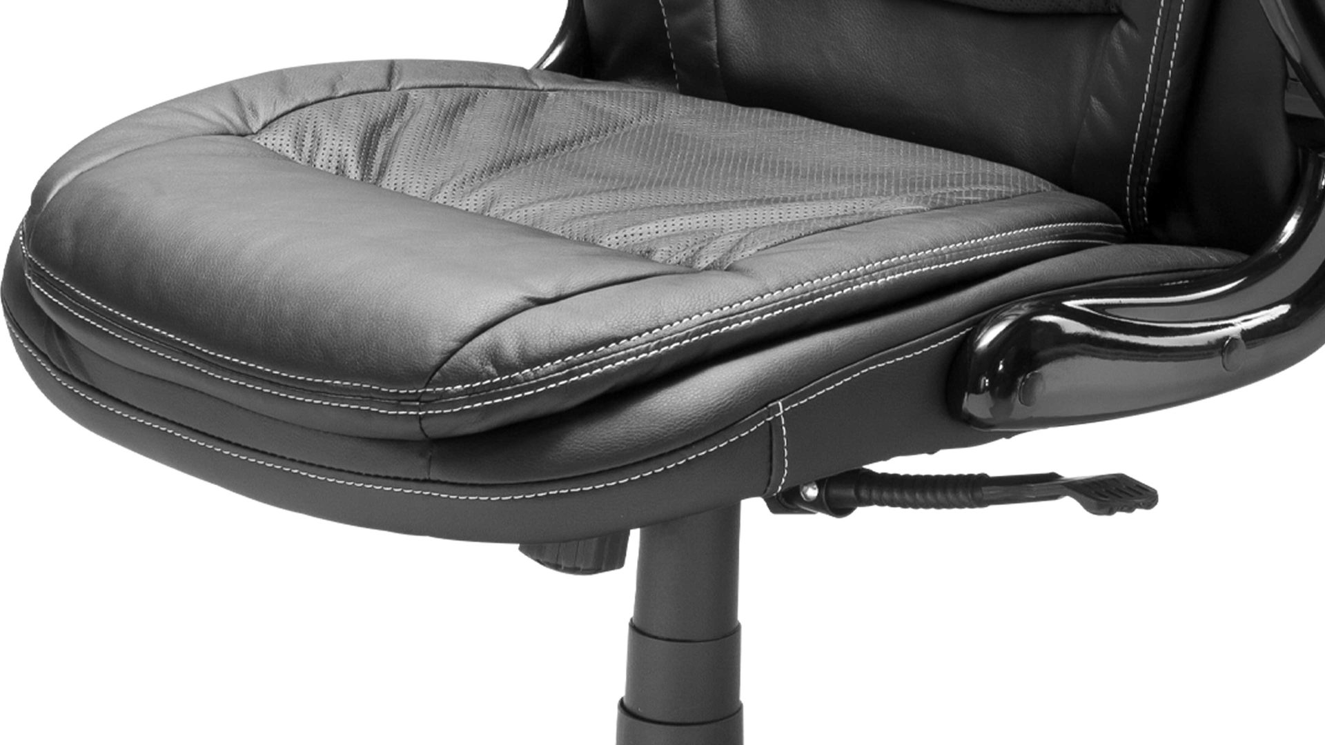Sein hochwertiger Kunstlederbezug sowie das in Schwarz gehaltene Drehkreuz und die Armlehnen sorgen dafür, dass diese funktionale Sitzgelegenheit Ihren hohen Anforderungen standhält. Die hochglänzenden schwarzen Amlehnen lassen sich nicht nur hochklappen, sie sind auch für eine entspannte Armhaltung bequem gepolstert.