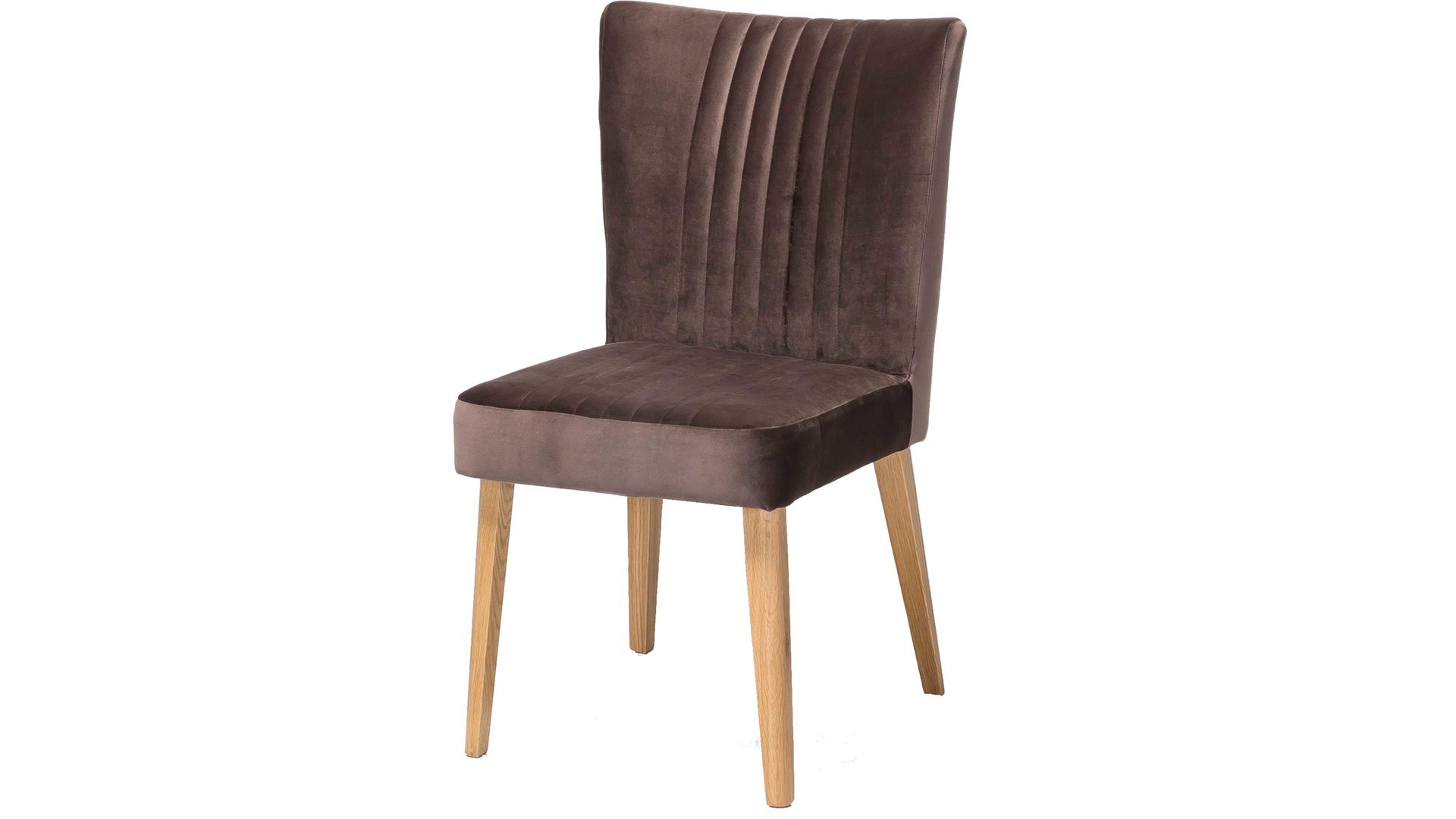 Im modernen Samtlook präsentiert sich dieser hochwertige Polsterstuhl mit braunem Bezug. Aufwendige Steppnähte, die auf Sitz und Rücken angebracht sind, verleihen dem Sitzmöbel eine raffinierte Optik. Stellen Sie den funktionalen Stuhl mit den Maßen von ca. 46 x 92 x 66 cm (BxHxT) am besten gleich zu mehreren an einen Esstisch aus Eiche, denn das Holzgestell des Sitzmöbels besteht ebenfalls aus Eiche natur.