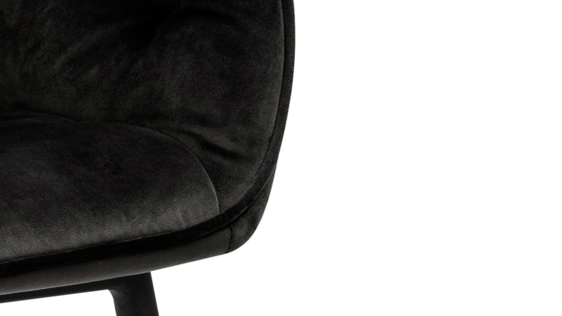 Dabei harmoniert der Polsterstuhl in seiner sanften Formensprache mit zahlreichen Einrichtungsstilen. Moderne Geradlinigkeit ergänzt er ebenso stimmig wie den beliebten Vintage-Trend. Auch farblich erlaubt der Esszimmerstuhl Brooke angenehme Freiheit beim Kombinieren: Dafür sorgt der graubraune Bezug aus Samt, der die gesamte Sitzschale inklusive der bequemen Armlehnen weich umhüllt. Die rau pulverbeschichteten Metallfüße fließen in mattem Schwarz stimmig in das Gesamtbild ein.
