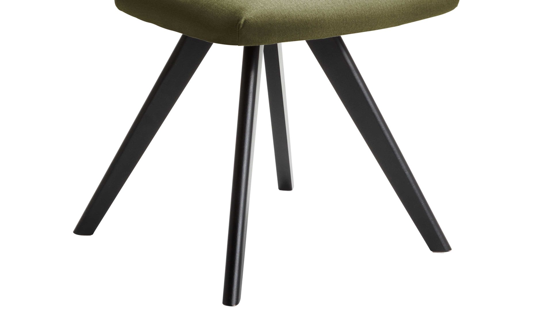 Der Polsterstuhl Eldar präsentiert sich modern und extravagant designt. Zudem ist er hochwertig verarbeitet und ungemein bequem. Mit der gelungenen Kombination aus dem edlen olivgrünen Stoffbezug und dem schwarz lackierten Buchenholzgestell strahlt der Stuhl noble Eleganz und einladende Gemütlichkeit aus. Für das gewisse optische Etwas sorgt die aufwendig gesteppte Rückenlehne.