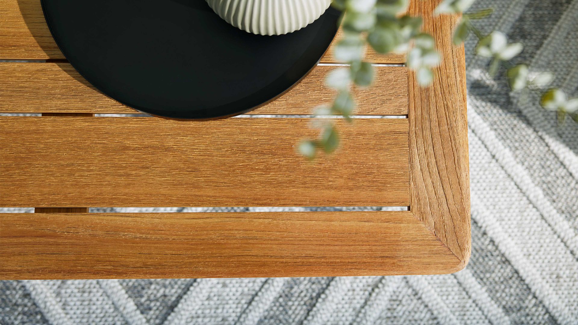 Herzstück des Sets ist der Lounge-Sofatisch mit einer Platte aus leicht gebürsteten Teakholzlamellen. Das anthrazitfarben pulverbeschichtete Aluminiumgestell sorgt für Stabilität und eine moderne Optik. Der Tisch kommt montiert zu Ldir nach Hause und bietet mit ca. 89 x 38 x 89 cm (BxHxT) viel Platz für Getränke, Snacks oder Deko.