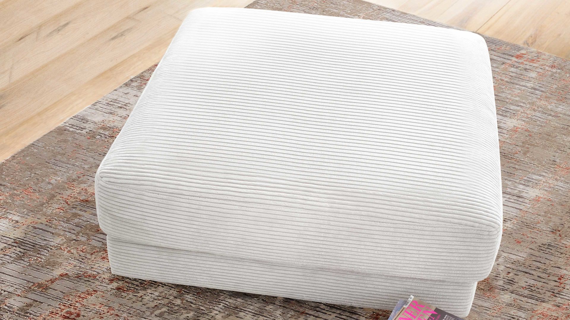 Der Polsterhocker aus dem Polsterprogramm SOFAkultur Seventies ist mit schneeweißem Cord bezogen und mit schwarzen Kunststoff-Gleitfüßen versehen. Er strahlt Modernität und Gemütlichkeit aus. Dank der schichtweise aufgebauten PUR-Schaumpolsterung auf einer gut stützenden Wellenunterfederung bietet der Hocker hohen Sitzkomfort. Er eignet sich auch als praktische Fußablage.