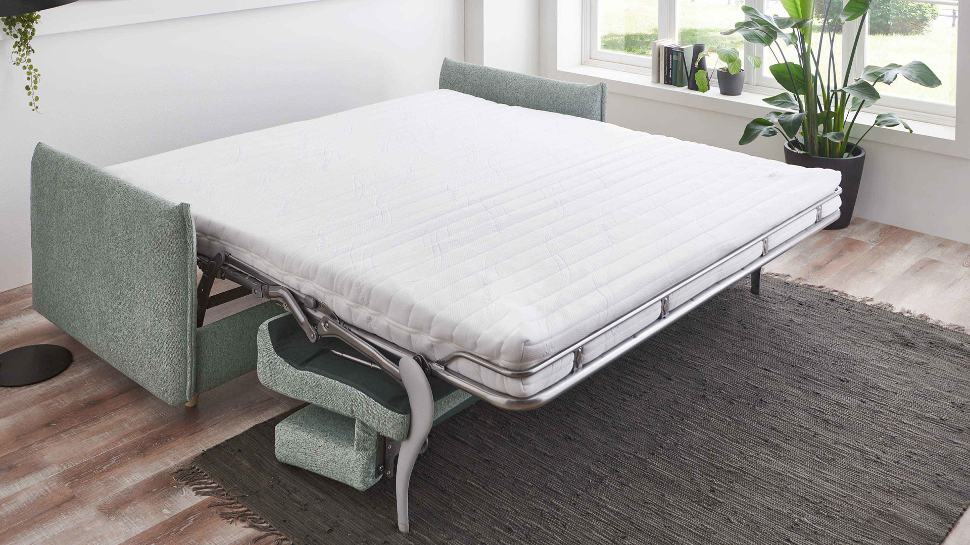Das Schlafsofa Grande ist ein hochwertiges Möbelstück, das sowohl als Sofa als auch als Bett genutzt werden kann. Es verfügt über einen grünen Stoffbezug, der dem Raum eine frische und natürliche Atmosphäre verleiht. Die naturbelassenen Buchefüße geben dem Verwandlungssofa eine moderne und stilvolle Optik.