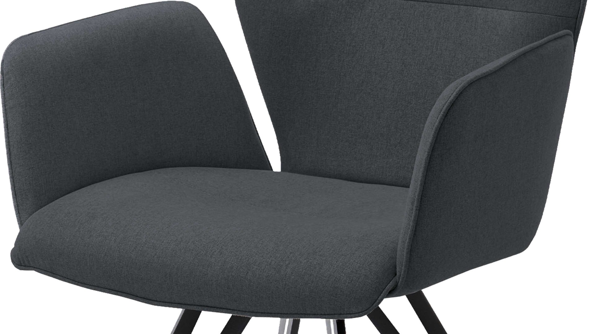 Ein eindrucksvoller Designer-Armlehnstuhl im Skandi-Look. Das hochwertige Modell Merlot präsentiert sich klassisch-schlicht, aber dennoch stilvoll. Der Esszimmerstuhl verfügt über einen graphitfarbenen Webstoffbezug sowie ein schwarz pulverbeschichtetes Vierfuß-Flachstahlgestell. Bei Maßen von ca. 62 x 91 x 60 cm (BxHxT) weist er eine komfortable Sitzhöhe von ca. 49 cm auf.