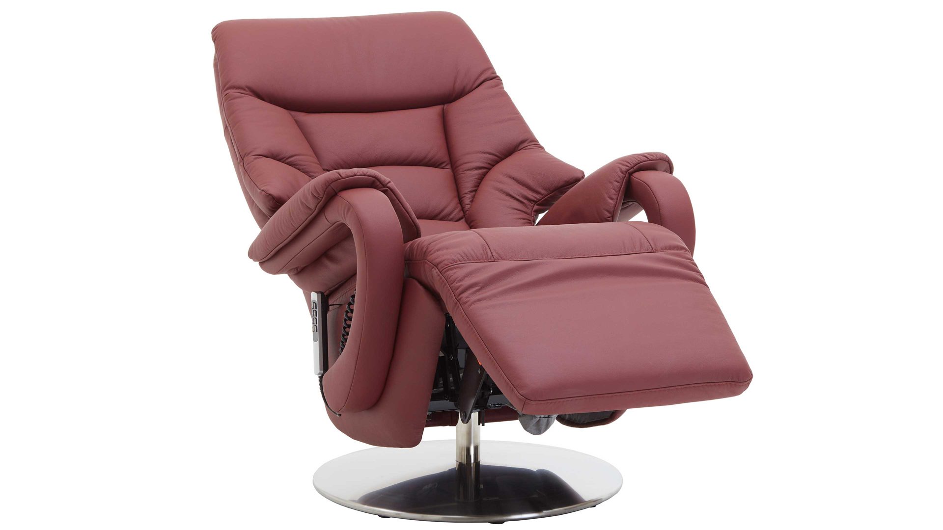 Dieser Relaxsessel kombiniert einen robusten glänzenden Edelstahl-Tellerfuß mit einem stilvollen merlotfarbenen Lederbezug. Durch die optimal aufeinander abgestimmten Materialien und Farben strahlt der Fernsehsessel moderne Eleganz aus. Für die nötige Stabilität sorgt der Stahlrohrrahmen. Er macht den TV-Sessel bis 130 kg belastbar. Die Maße des hochwertig verarbeiteten Relaxsessels belaufen sich auf ca. 80 x 116 x 80 cm (BxHxT), bei einer Sitzhöhe von ca. 49 cm und einer Sitztiefe von ca. 55 cm.