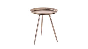 Mit seinem modernen, extravaganten Design wird dieser Beistelltisch zum dekorativen Hingucker im Wohn- oder Schlafzimmer, aber auch im Flur oder Home Office. Dazu überzeugt er qualitativ. Sowohl die Tischplatte als auch das dreibeinige Gestell besteht aus antikbronzefarben lackiertem Metall.