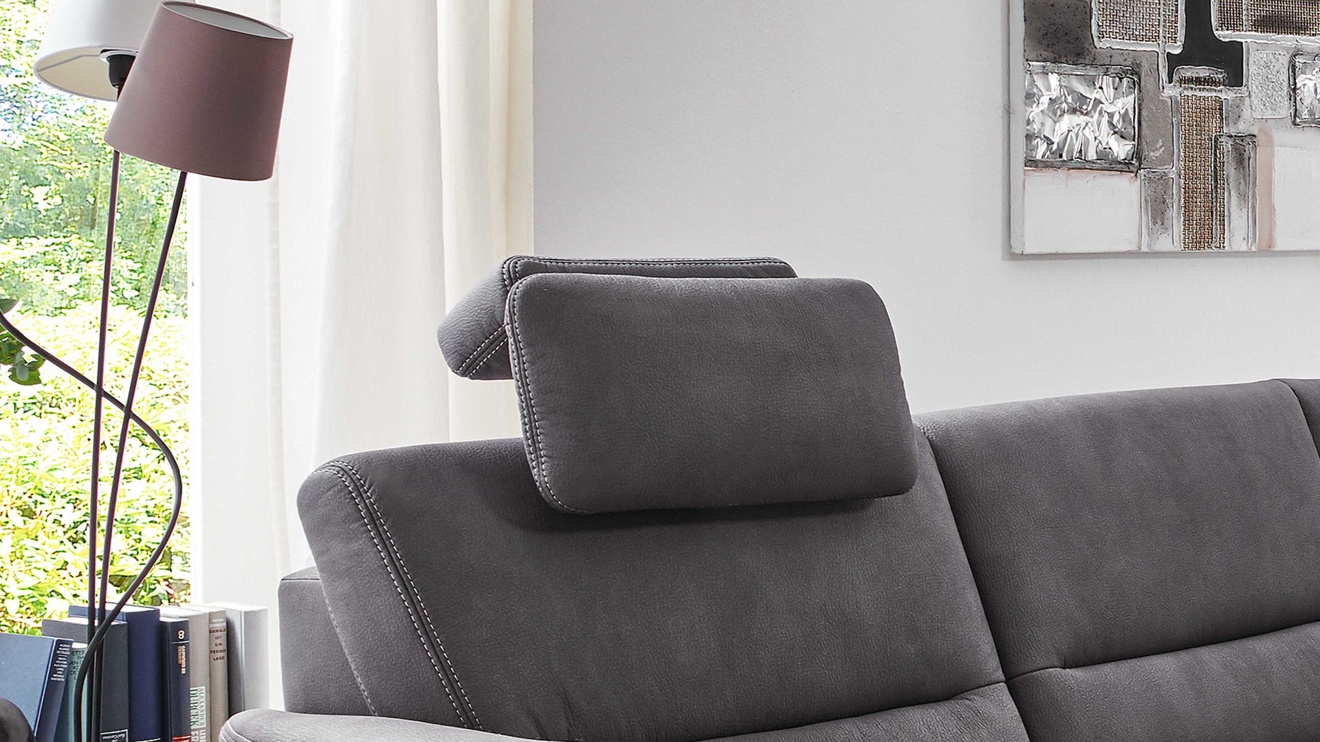 Die Eckkombination besteht aus drei Teilen: dem Canapé CanL mit Armlehne links und stoffbezogener Rückseite, dem 2,5-Sitzer 2,5EL ohne Armlehnen sowie dem Einsitzer-Kombielement 1KOR mit offenem Abschluss rechts und wiederum stoffbezogener Rückseite. Ihre Stellfläche beträgt ca. 316 x 203 cm; die Schenkelmaße belaufen sich auf ca. 173 x 316 x 203 cm (BxLB, von links nach rechts).