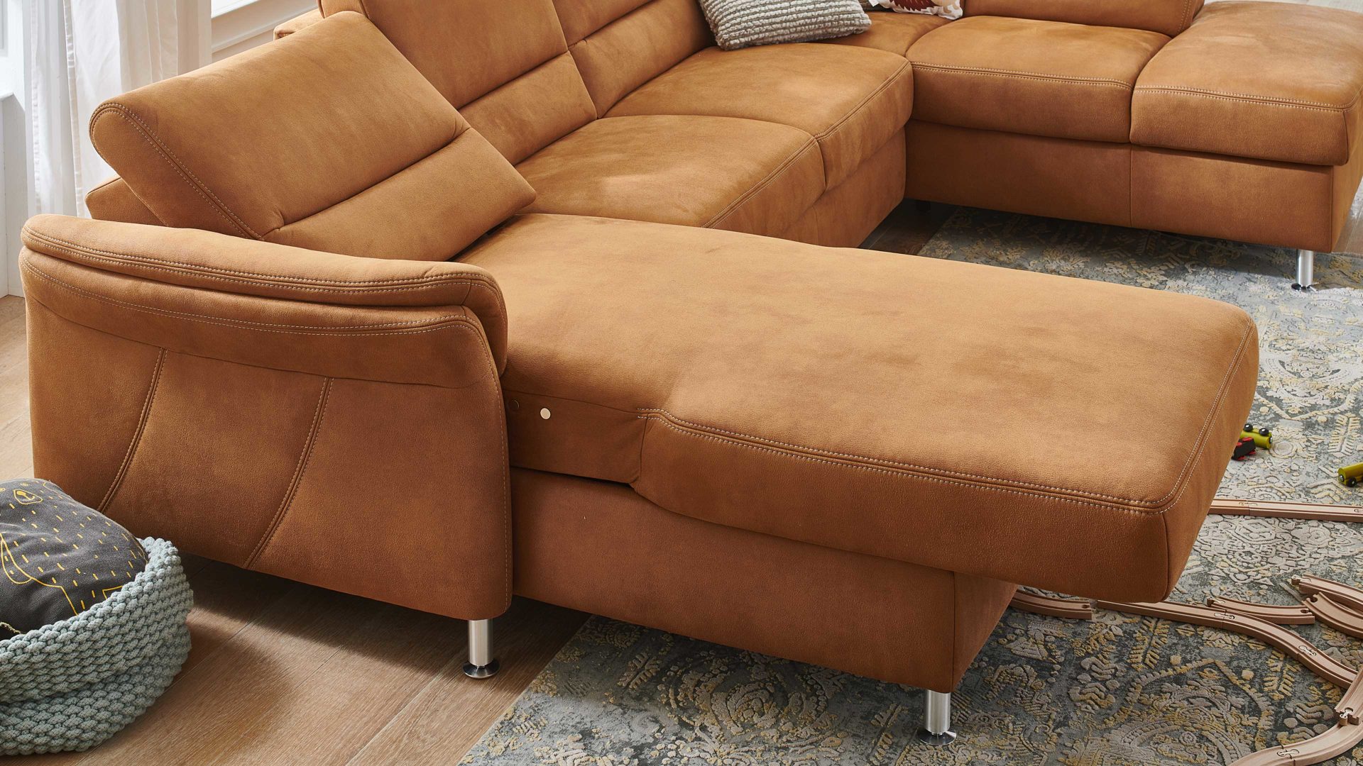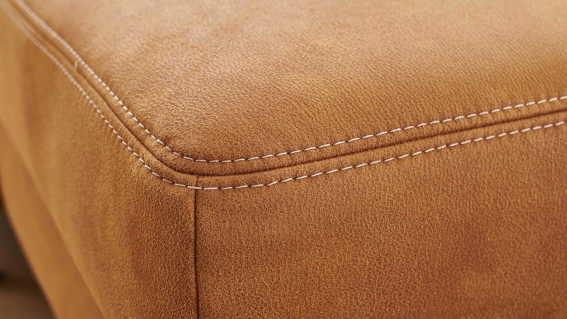 Sie ist mit trendig zimtfarbenem Stoff bezogen, der edle Gemütlichkeit ausstrahlt und mit unterschiedlichen Einrichtungen bestens harmoniert. Einen gelungenen Akzent setzt die beige Kontrastnaht. Runde aluminiumfarbene Metallfüße vervollständigen das stilvolle Design und verleihen dem Sofa zudem die nötige Standfestigkeit.