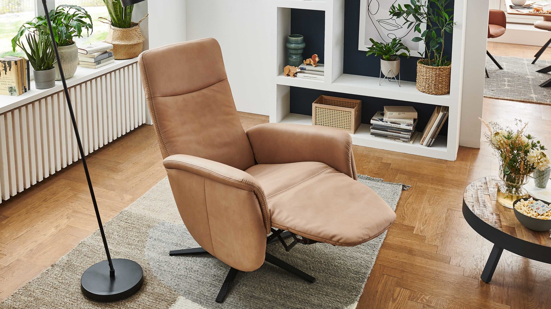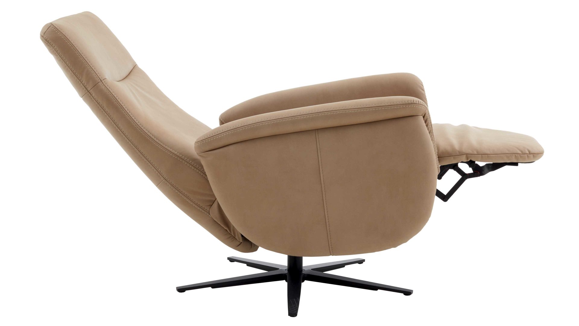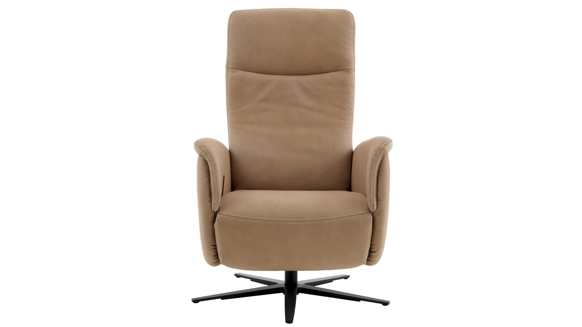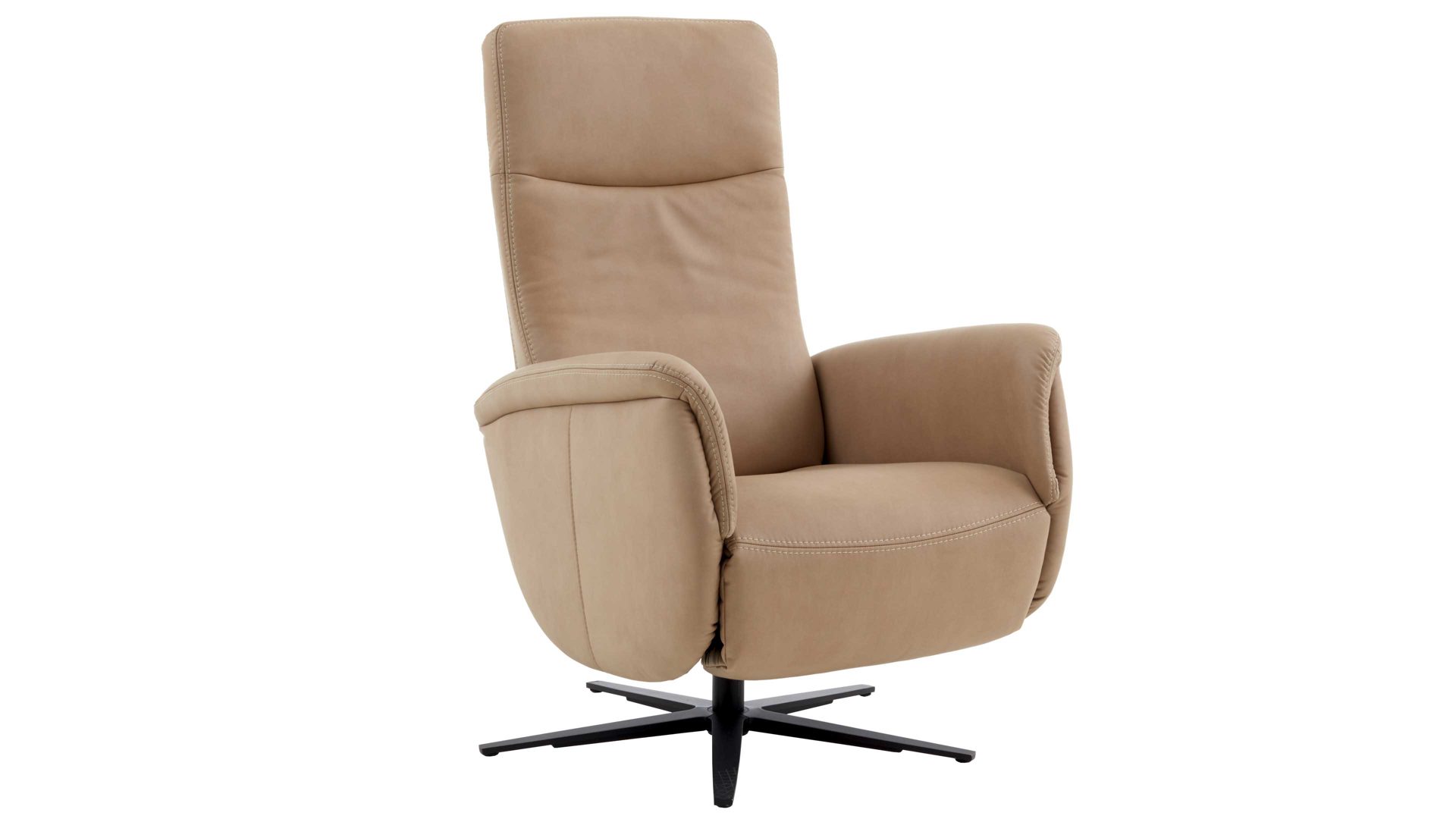 Mit dem camelfarbenen Mikrofaserbezug Galero samt beigefarbener Kontrastnaht und dem mattschwarzen Aluminium-Sternfuß V1S strahlt der Relaxsessel 1DRF aus dem großen Modulmaster Programm MM-ZE1062 moderne Eleganz aus.