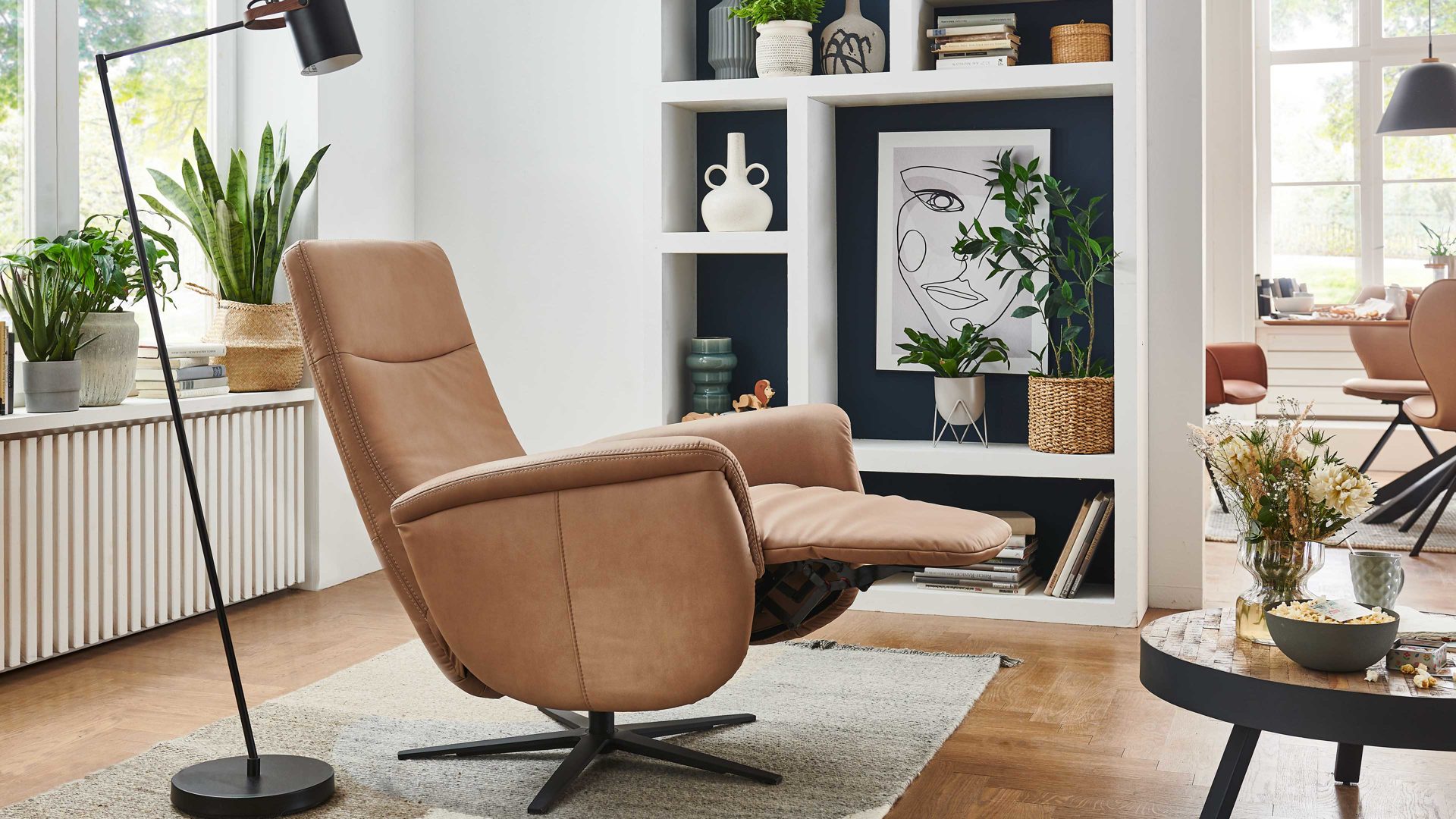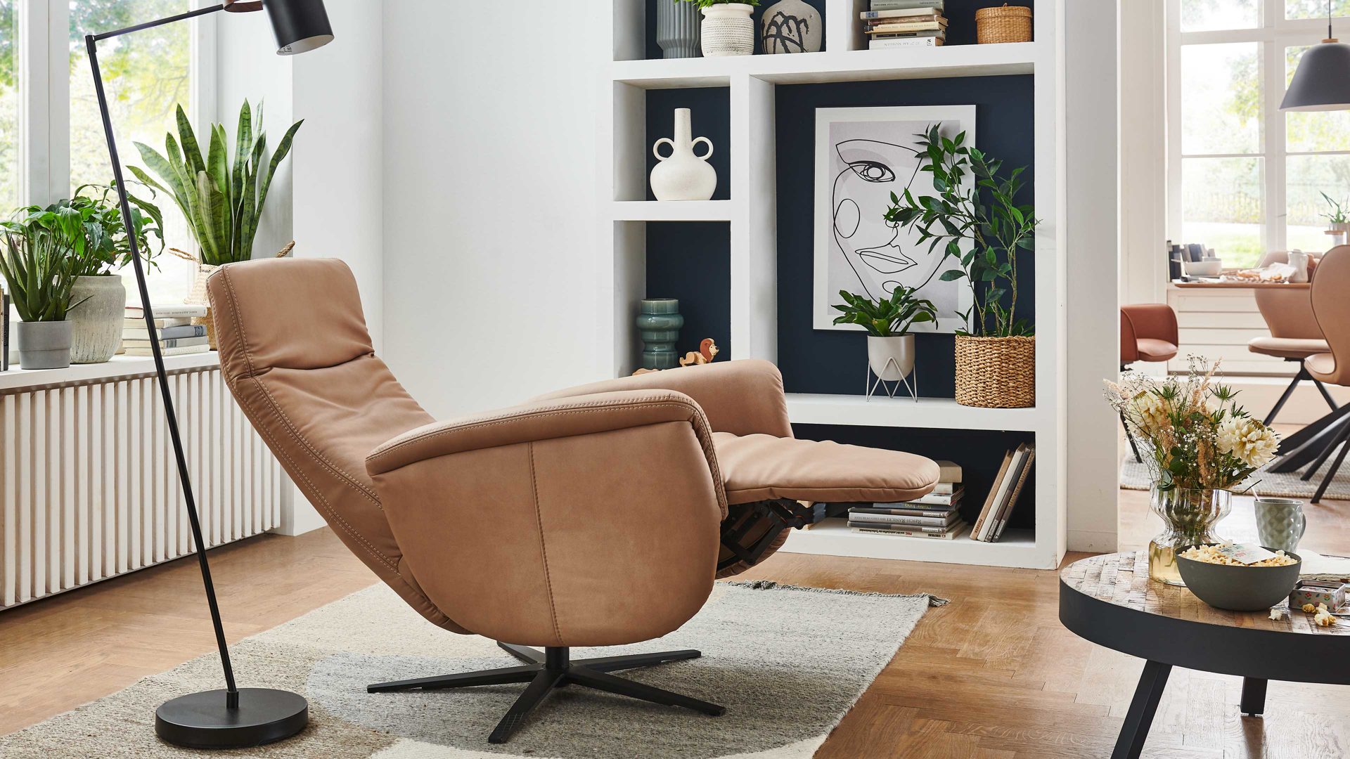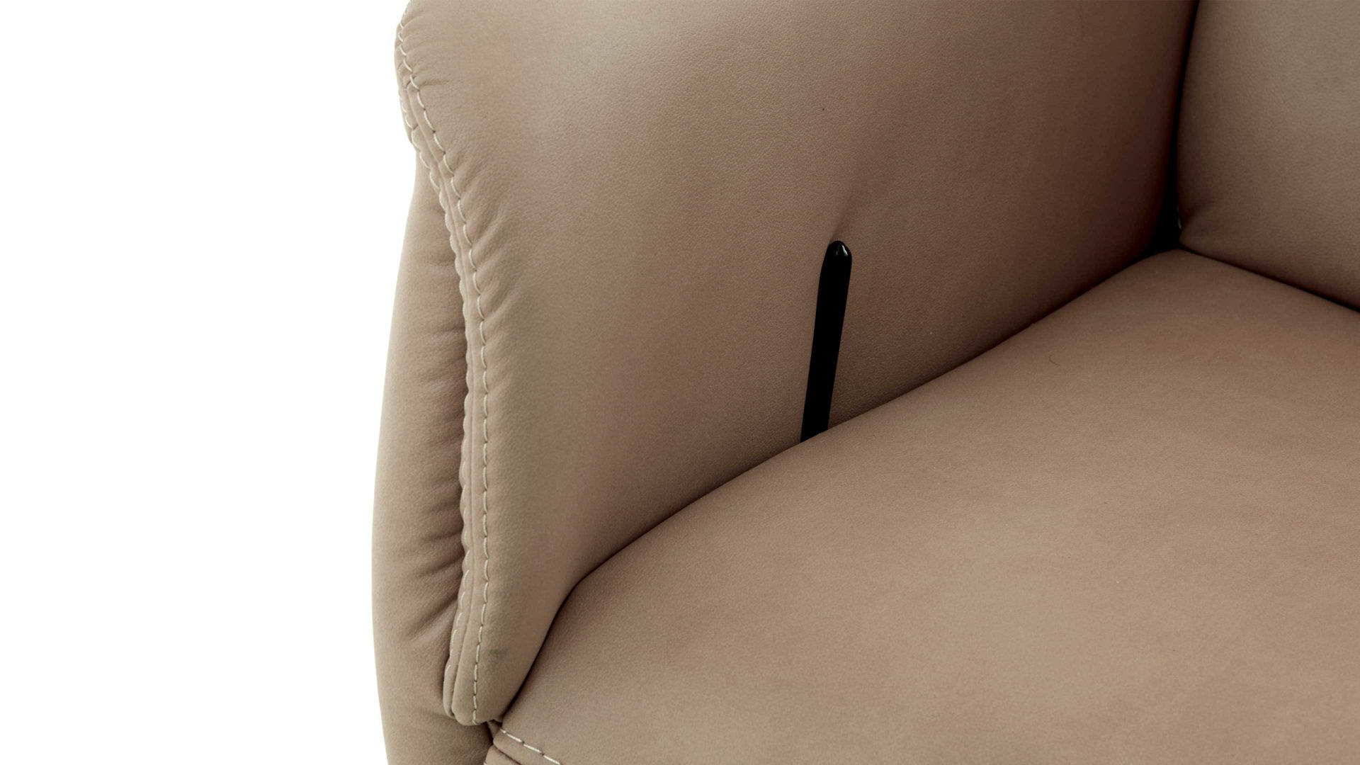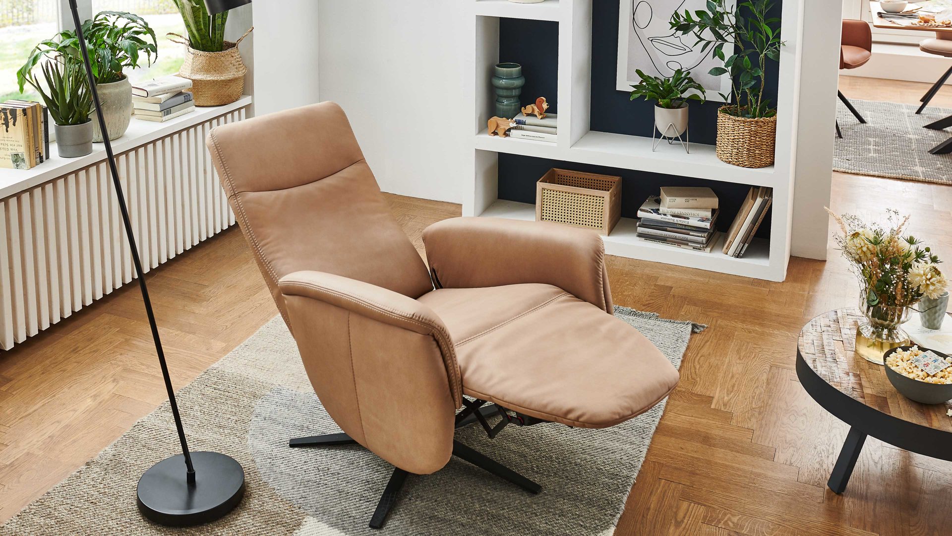 Mit dem camelfarbenen Mikrofaserbezug Galero samt beigefarbener Kontrastnaht und dem mattschwarzen Aluminium-Sternfuß V1S strahlt der Relaxsessel 1DRF aus dem großen Modulmaster Programm MM-ZE1062 moderne Eleganz aus.
