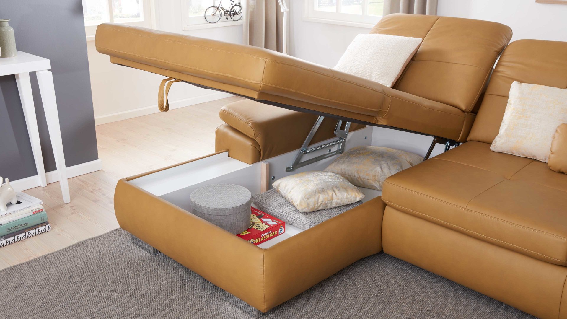 Die Aufklappfunktion F ist eine Ergänzung für die Canapés aus dem Modulmaster-Programm MM-PN1044. Sie geht mit praktischem, innen weiß beschichteten Stauraum einher, beispielsweise für Zierkissen und Kuscheldecken, wenn diese gerade nicht benötigt werden. Selbstverständlich können Sie je nach Bedarf auch andere Utensilien im aufklappbaren Canapé unterbringen.