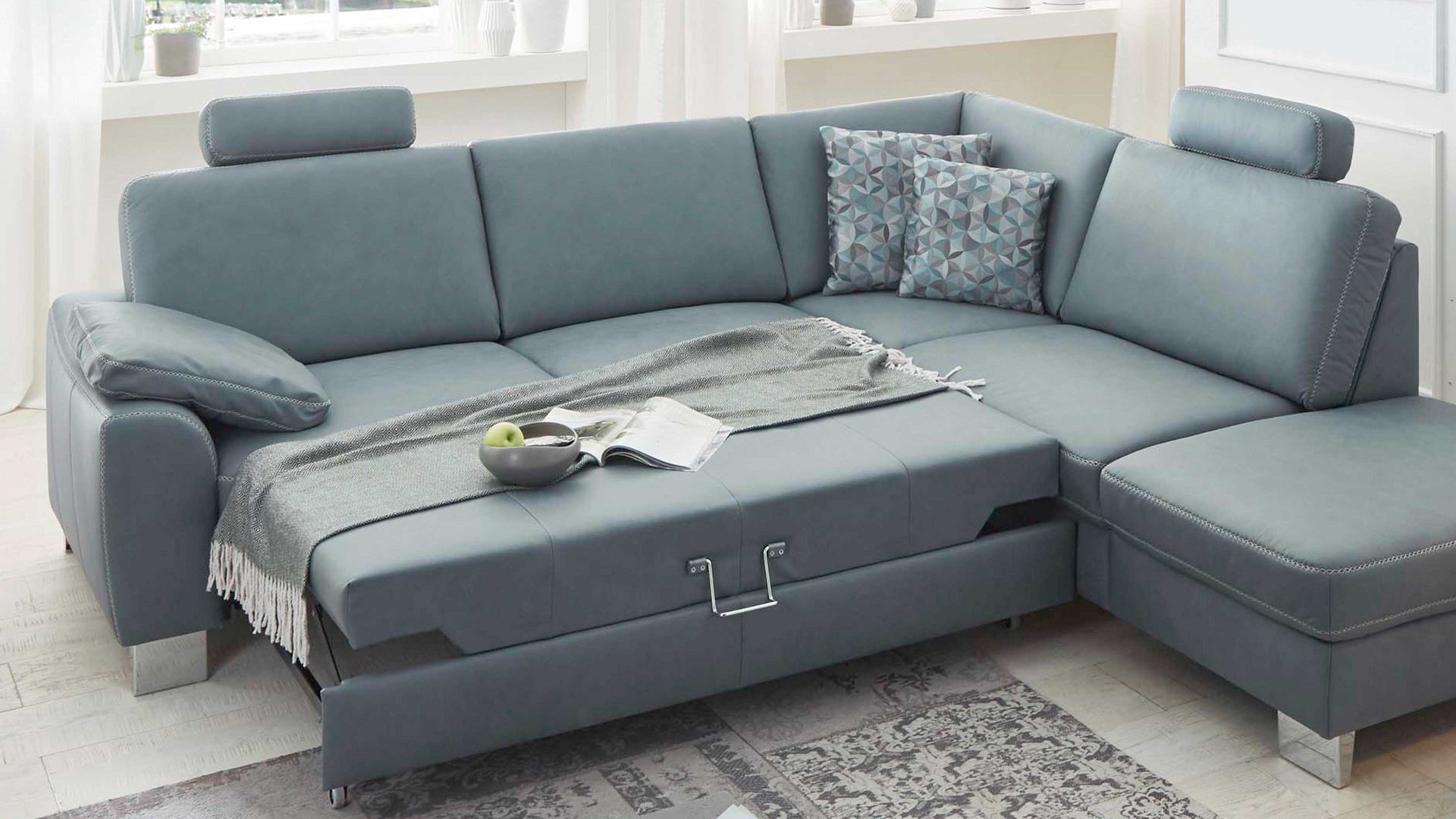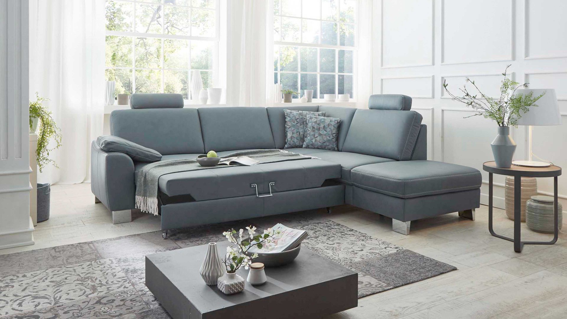 • Die Abbildung zeigt ein Wohnbeispiel, welches auch Dekoration sowie separat erhältliches Zubehör enthält. Im Lieferumfang enthalten ist ein Ecksofa.