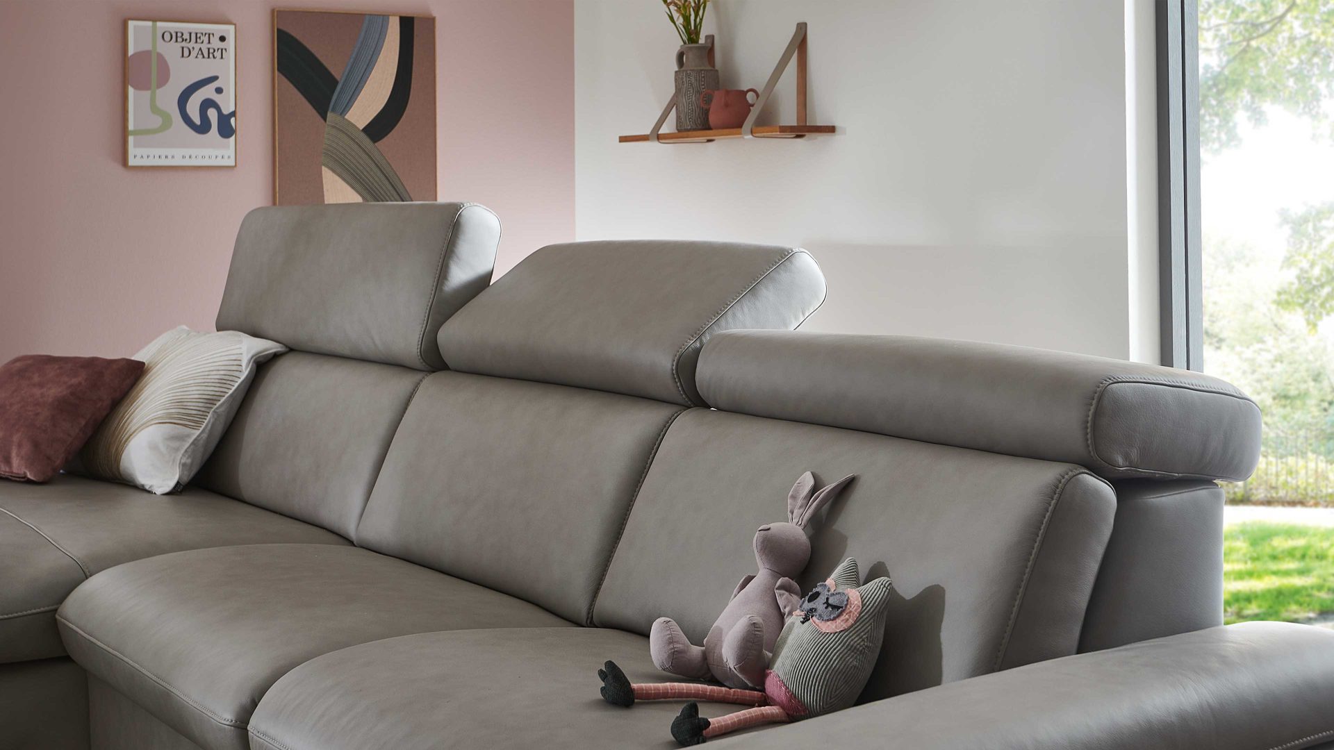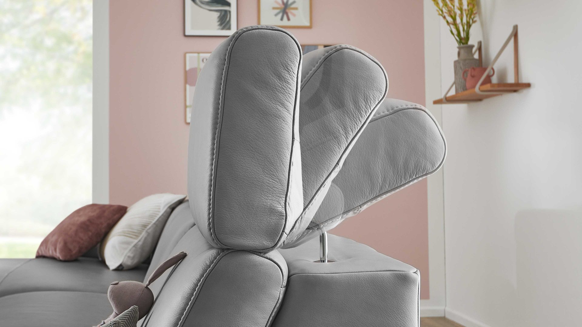 Die Kopfteilverstellung KV mit Faltenoptimierung ist ein Funktions-Mehrpreis für verschiedene Möbel aus der Modulmaster-Polsterserie MM-PN1161. Mittels Rasterbeschlag können Sie das Kopfteil manuell mehrfach in der Neigung verstellen, sodass die Gesamthöhe der jeweiligen Couch von ca. 85 bis 110 cm variiert.