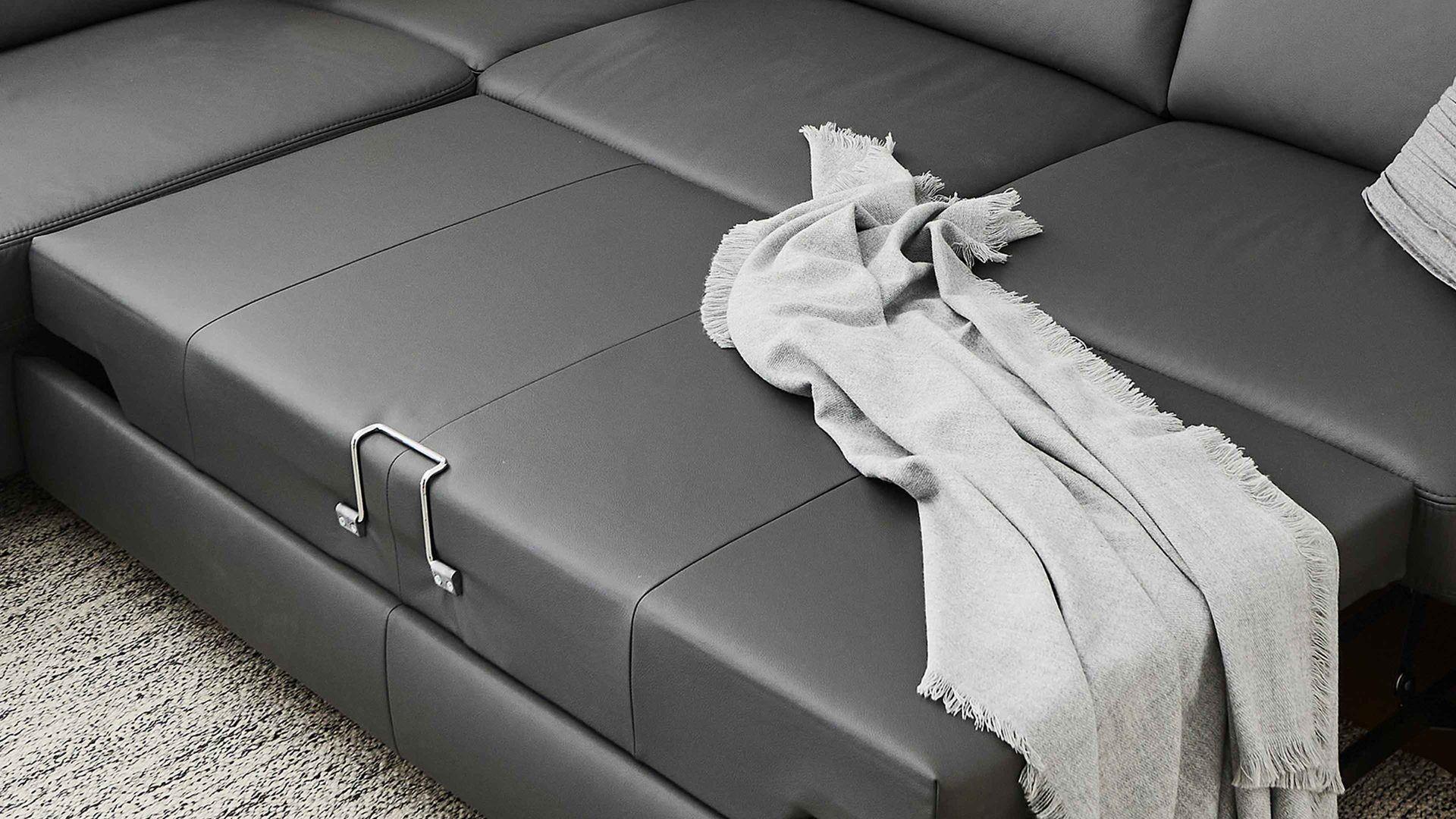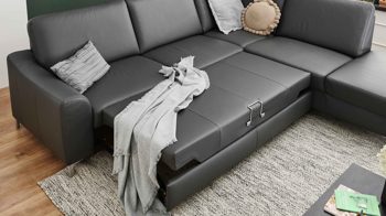 Die lederbezogene Liegefläche ist ein Mehrpreis für die Möbel mit Bettfunktion aus dem Modulmaster-Polsterprogramm MM-PN1168. Durch dieses Extra präsentiert sich die Liegefläche im Originalbezug des jeweiligen Sofas. Das anthrazitfarben pigmentierte Glattleder präsentiert sich modern und elegant.