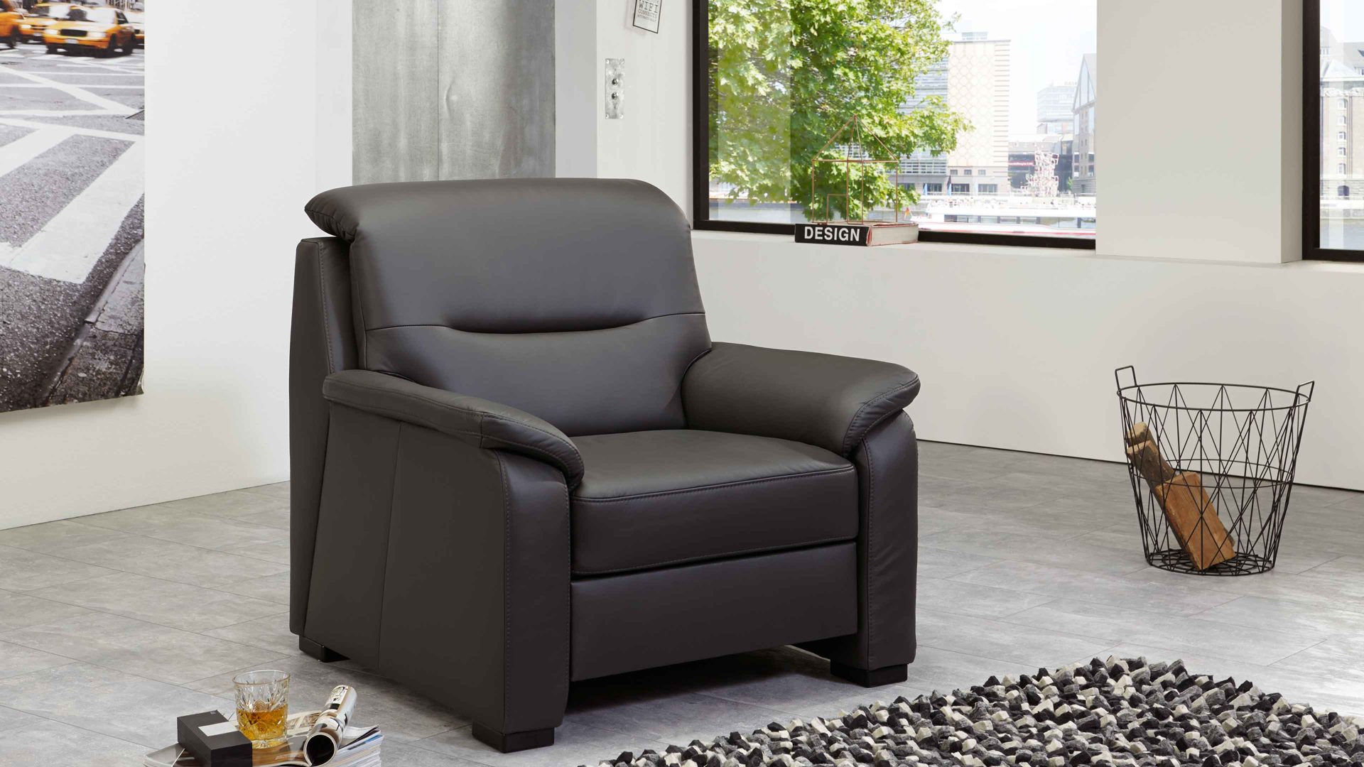 Der Sessel aus dem Modulmaster-Polsterprogramm MM-PN1009 kombiniert anthrazitfarben pigmentiertes Glattleder mit schwarzen Holzfüßen. Er strahlt moderne Eleganz aus.