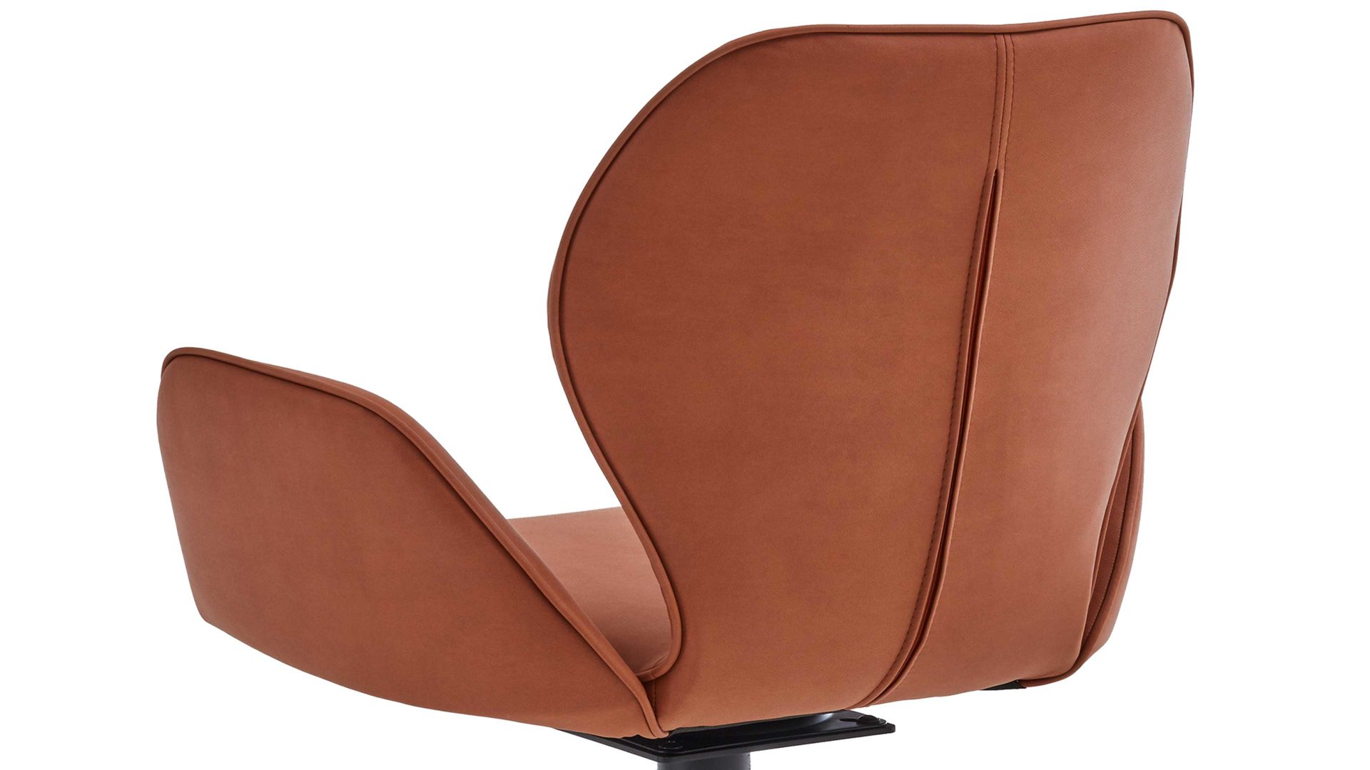 Er kombiniert ein mattschwarz lackiertes Stativgestell aus robustem Eisen mit einem cognacfarbenen Mikrofaserbezug in Lederoptik und fügt sich in verschiedene Wohnstile harmonisch ein. Zu den optischen Highlights des Esszimmerstuhls gehört neben der Formensprache und den perfekt aufeinander abgestimmten Farben der markante Quereinzug im Rücken. Praktisch begeistern die Drehbarkeit um 180 Grad mit Rückholfunktion sowie die bodenschonenden Gleiter am Gestell.