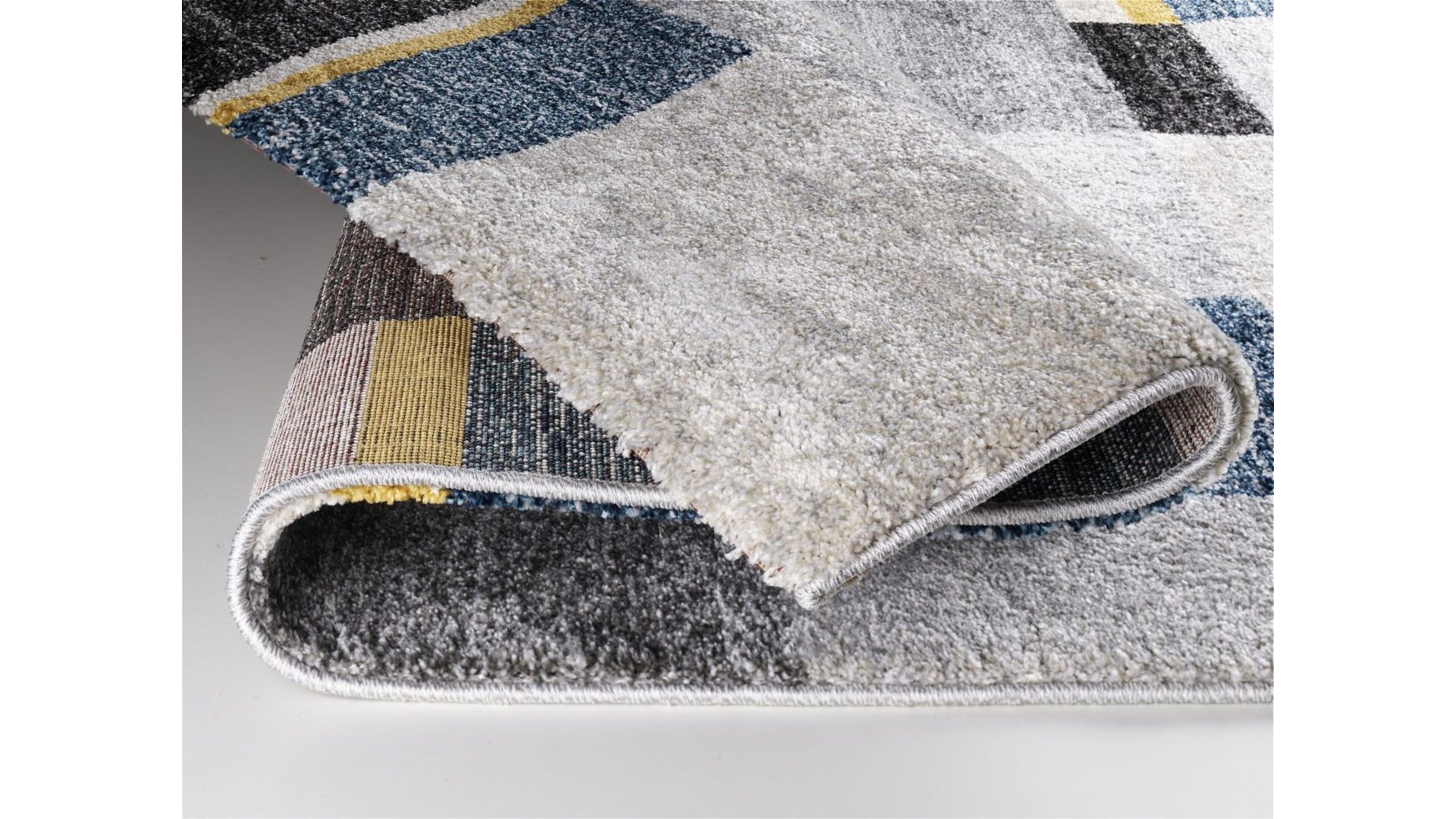 Moderne Mosaikstruktur in angenehm-dezenten Farbverläufen. Mit geometrisch angeordneten Vierecken verschiedener Größe und Kolorierung gehört der Designerteppich Castle Beppo zu den Wohnaccessoires, die für Form- und Farbenvielfalt sorgen und dabei eine gleichmäßige Struktur und ein harmonisches Karreefeld erzeugen. Der Webteppich ist seitlich gekettelt und vor Kopf umgeschlagen.