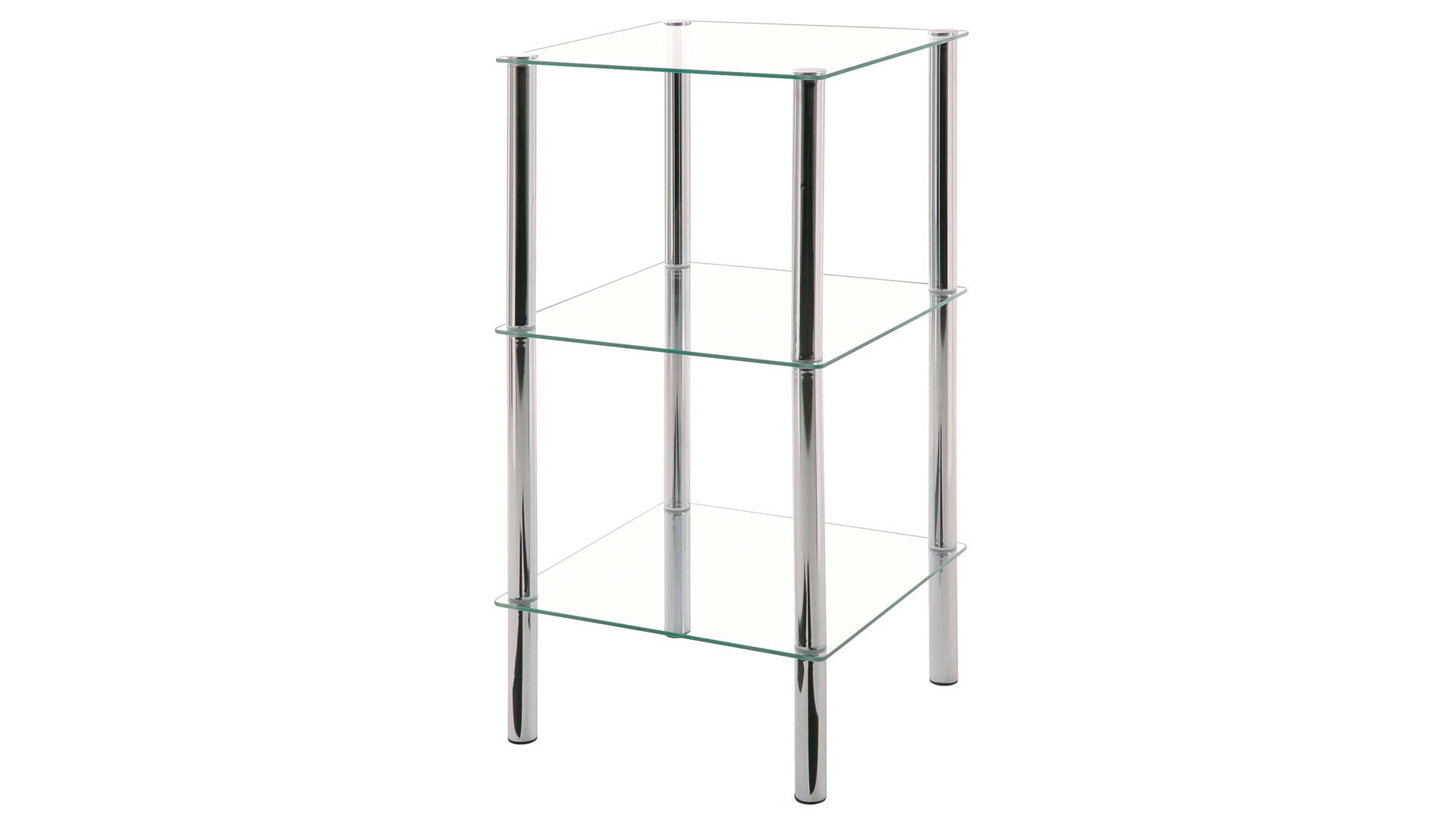 Das stilvolle Glasboden-Regal erweist sich als idealer Partner, wenn es darum geht, Ihre Wohnzimmereinrichtung aufzuwerten. Die verchromten Stahlfüße des Kleinmöbels verbinden sich mit drei Klarglasplatten zu einem stimmigen Designkonzept. Mit Maßen von ca. 39 x 77 x 39 cm (BxHxT) ist das Regal nicht nur schön kompakt, sondern auch überraschend geräumig. Drei Böden halten ausreichend Platz für Zeitschriften, einen Blumentopf, Teelichter sowie weitere Dekoaccessoires bereit.