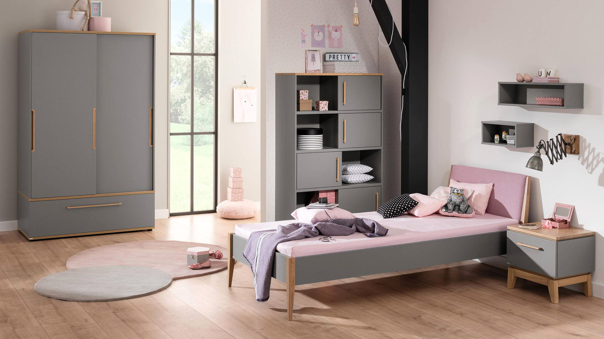Das hochwertige PAIDI Bettgestell Sten kombiniert massive Eiche mit schiefergrauen Melaminoberflächen und einem dunkelrosa stoffbezogenen Polsterkopfteil. Letzteres zeichnet sich durch seine angenehme Haptik sowie den Anlehnkomfort aus, den es beim Sitzen im Bett bietet.