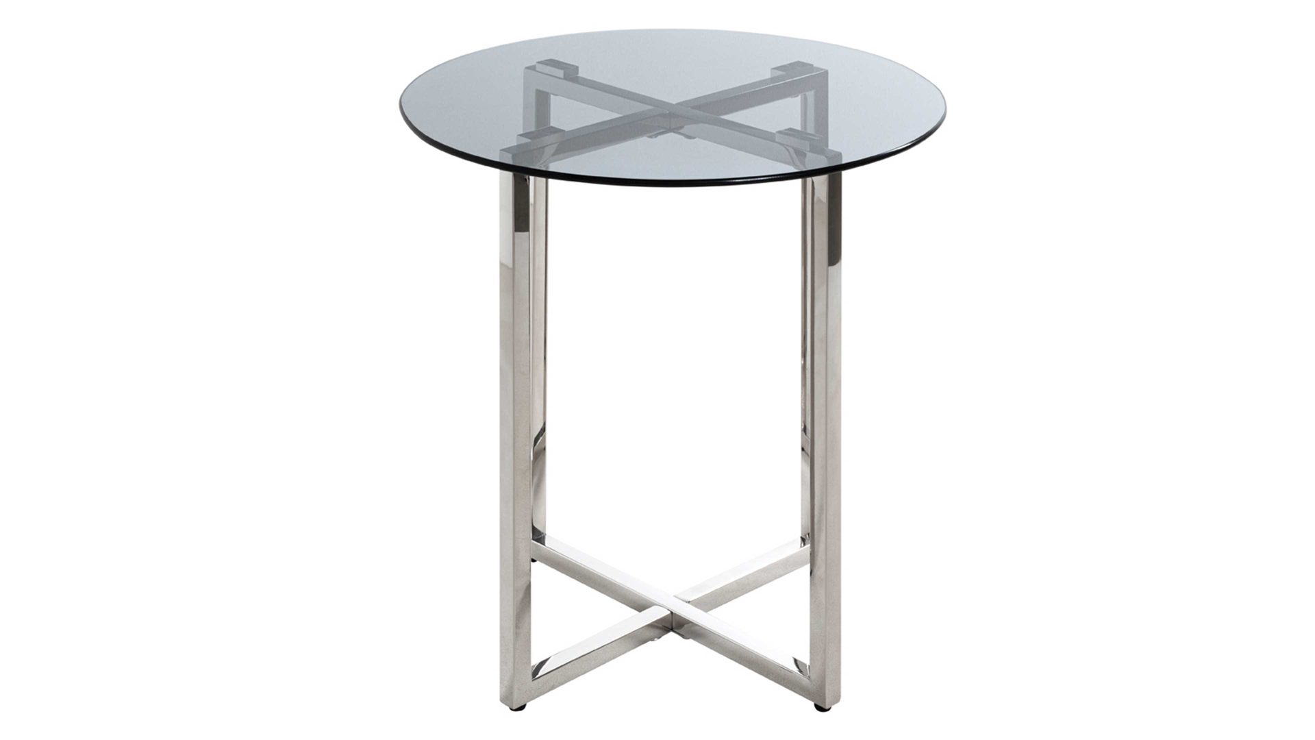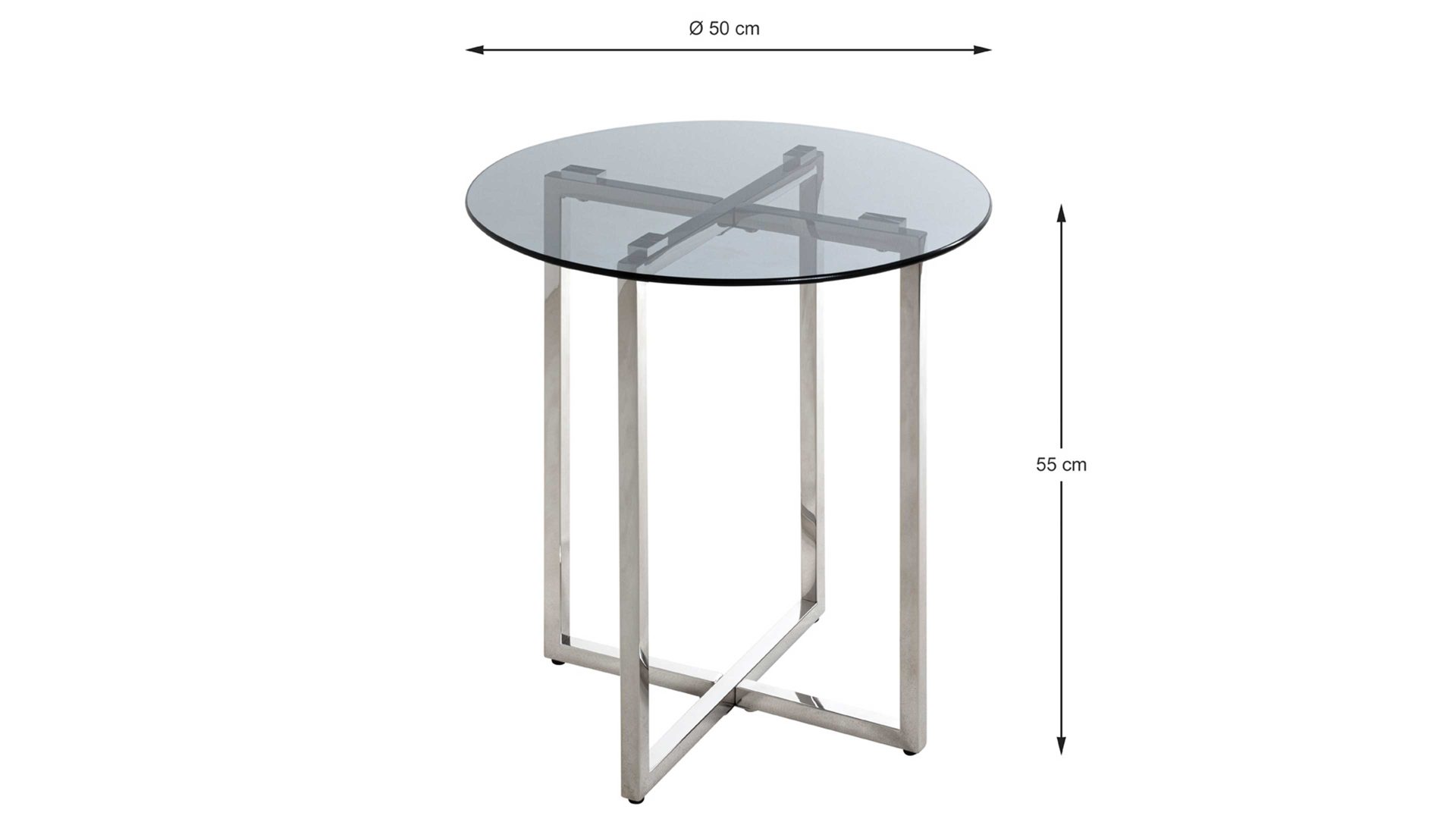 Dieser hochwertige Beistelltisch verkörpert die Eleganz schlichter Modernität. Mit dem polierten Edelstahlgestell und dem grau getönten Floatglas erscheint er puristisch und ist dazu sehr robust und langlebig. Bei dem Glas handelt es sich um qualitativ erstklassiges Sicherheitsglas mit einer Stärke von 8 mm. Der Tisch hat einen Durchmesser von ca. 50 cm und ist ca. 55 cm hoch.