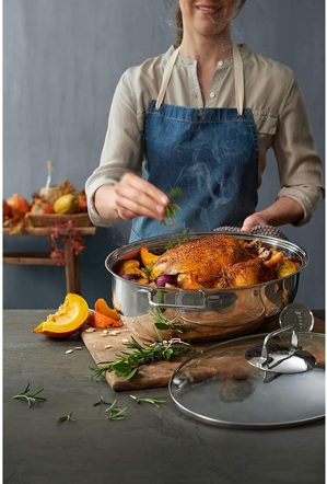 WMF Bräter inklusive Bratenthermometer und Glasdeckel. Der Bräter ist komplett aus Edelstahl gefertigt und sehr pflegeleicht. Er kann sowohl auf dem Kochfeld als auch im Backofen genutzt werden. Ein Bratenthermometer gehört zum Lieferumfang dazu und hilft beim punktgenauen Kochen von zum Beispiel Fleisch, Fisch, Geflügel oder Gemüse.