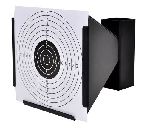 Dieser hochwertige, quadratische Kugelfang ist eine hervorragende Trainingshilfe für Schießübungen. Der Scheibenkasten ist aus strapazierfähigem Stahl gefertigt, wodurch er robust und langlebig ist. Dieser Kugelfangkasten fasst 14x14 cm große Papierscheiben. Sein Trichter-Design hilft, Abpraller zu reduzieren. Der Kugelfang fängt Luftgewehr-Munition automatisch auf, was das Aufräumen erleichtert. Dieser Kugelfang kann freistehend oder an einem Pfosten oder Wand befestigt verwendet werden. Die Lieferung umfasst auch eine Packung mit 100 Zielscheiben aus Papier (14 cm).