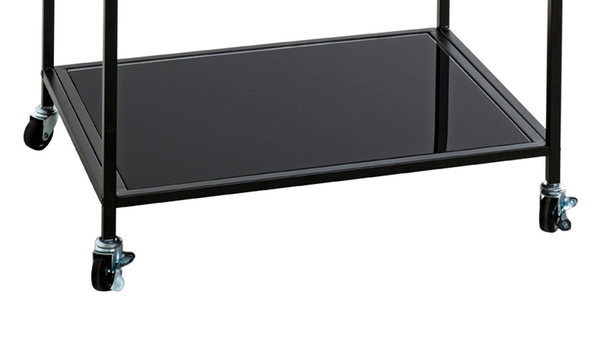 Dieser hochwertige Servier- und Beistellwagen repräsentiert die Eleganz schlichter Modernität. Aus klassisch schwarz lackiertem Metall und schwarzem Sicherheitsglas gefertigt, erscheint er puristisch und ist dazu enorm robust und langlebig.