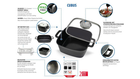 | Materialeigenschaft: | pflegeleicht spülmaschinengeeignet backofenfest kratzfest beschichtet | |
