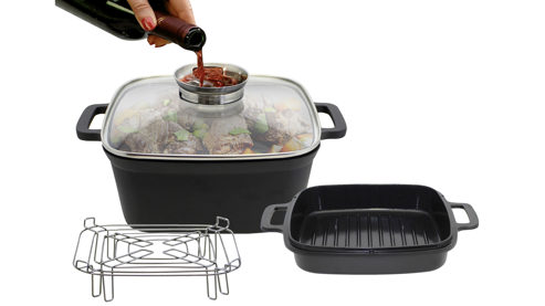 Aluguss-Deckel mit eingearbeiteten Griffen und Grillrippen