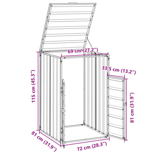 Diese Mülltonnenverkleidung verbirgt diskret deine Mülltonnen und verwandelt deinen Außenbereich in eine schöne und aufgeräumte Umgebung. Robustes und langlebiges Material: Der pulverbeschichtete Stahl bietet Festigkeit, Stabilität, Haltbarkeit sowie Widerstandsfähigkeit gegen Korrosion und rauen Wetterbedingungen und gewährleistet so eine lange Nutzungsdauer.Praktischer Deckel-Mechanismus: Der Deckel ist mit Ketten ausgestattet, die am Mülltonnendeckel befestigt werden. Dadurch wird der Deckel der Mülltonne geöffnet, wenn der Mülltonnenbox-Deckel hochgeklappt wird.Einfacher Zugang: Die Fronttüren mit Riegel machen das Herausnehmen der Mülltonnen und Einsetzen der Müllsäcke zum Kinderspiel und sorgen so für eine mühelose Abfallentsorgung.Gute Belüftung: Die Lüftungsschlitze an den Paneelen fördern die Luftzirkulation und verhindern die Geruchsbildung im Inneren der Müllbox.Flexibles Design: Diese Mülltonnenbox lässt sich durch das Anbringen von zusätzlichen Erweiterungen vergrößern, um so Platz für mehr Tonnen zu bieten. Diese Erweiterungen sind einzeln im Shop erhältlich. ** Farbe: Anthrazit ** Material: Stahl ** Gesamtabmessungen: 72 x 81 x 115 cm (B x T x H) ** Tür-Größe: 67 x 81 cm (B x H) ** Geeignet für Standard-Mülltonnen mit einem Fassungsvermögen von 240 L ** Zusammenbau erforderlich: Ja