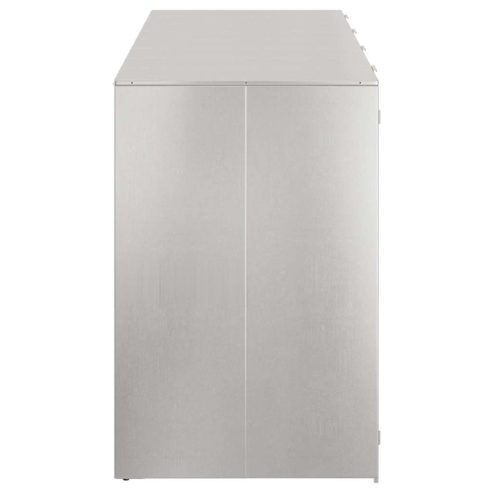 Die Mülltonnenaufbewahrung bietet eine schicke Lösung, um Abfallbehälter im Freien zu organisieren, ohne das Aussehen deines Gartens oder deiner Terrasse zu stören. Das moderne Design fügt sich perfekt in verschiedene Außenräume ein, und sie ist sowohl praktisch als auch gut aussehend. Für den Außeneinsatz gemacht, bleibt sie auch langfristig top in Schuss, während dein Raum ordentlich bleibt. Eine tolle Wahl für alle, die Wert auf Ordnung und Sauberkeit legen. Wasserabweisendes Material: Diese Mülltonnenaufbewahrung ist so gemacht, dass sie Regen und Sonne standhält, damit dein Müll trocken und sauber bleibt. Das UV-beständige Material sorgt dafür, dass die Farben und die Form auch bei jeder Witterung erhalten bleiben. Innovatives erweiterbares Design: Der Rahmen lässt sich wirklich ganz einfach anpassen, je nachdem, wie viele Mülltonnen du hast. Wenn du mehr Platz brauchst, kannst du ganz einfach andere Sektionen hinzufügen. Genial für wachsende Familien oder wenn du mehr Platz brauchst! Belüftetes Merkmal für Effizienz: Wegen der Belüftung bleibt die Luft gut zirkulieren, und das hilft, unangenehme Gerüche zu vermeiden. So bleibt alles hygienisch und angenehm, wenn du draußen bist. Stylisches modernes Design: Das moderne Design kombiniert einfache Linien mit Funktionalität. Es passt perfekt in jeden zeitgemäßen Garten oder jede Terrasse und macht alles noch schöner. Einfache Pflege & Wartung: Die Pflege ist ganz einfach; einfach mal mit einem feuchten Tuch drüberwischen, und schon sieht alles wieder neu aus. Mit diesem praktischen Zubehör wird alles noch einfacher und schöner für alle, die auf Nützlichkeit und schönes Aussehen Wert legen. ** Farbe: Silber ** Material: Edelstahl ** Gesamtabmessungen: 272 x 77,5 x 115,5 cm (B x T x H) ** Erweiterbar ** Belüftetes Design ** Geeignet für Standardmülltonnen mit einem Volumen von 120 L oder 240 L ** Magnettüren ** Gasdruckdeckel mit einem Bungee-Seil ** Innendimensionen (jeweils): 65 x 73 x 113 cm (B x T x H) ** Innen- / Außenbereich: Nur für den Außenbereich ** Lieferumfang: ** 1 x Rollcontainer Aufbewahrung ** Montage erforderlich: Ja