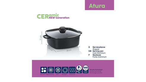 Ergänzen Sie Ihre Küche mit der Atura Servierpfanne aus Aluguss, die mit einer großzügigen Größe von 28x28 cm und einem Volumen von 6 Litern ideal für große Portionen ist. Die Pfanne verfügt über einen induktionsfähigen Allherd-Boden, der für eine gleichmäßige Hitzeverteilung sorgt und auf allen Herdarten verwendet werden kann. Die langlebige Keramikbeschichtung bietet einen hervorragenden Antihafteffekt und erleichtert die Reinigung. Der mitgelieferte Deckel hält die Wärme optimal im Inneren. Entdecken Sie auch die weiteren Accessoires aus der Atura-Serie für eine umfassende Küchenausstattung.