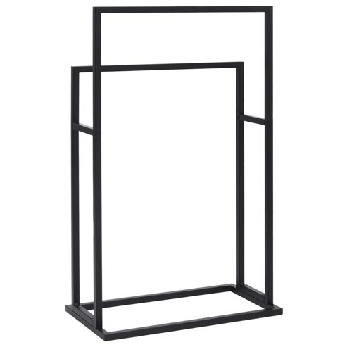 Diese Handtuchstange wird in deinem Badezimmer eine praktische Ergänzung und eine dekorative Bereicherung sein. Der freistehende Handtuchhalter ist aus solidem Eisen gefertigt, das ihn stabil und langlebig macht. Die Handtuchstangen auf 2 Höhen bieten ausreichend Platz zum Aufhängen von Handtüchern. So kannst du dein Badezimmer aufgeräumter gestalten. Außerdem kann der Handtuchständer auch zum Trocknen von Tüchern, Waschlappen oder anderen Sachen verwendet werden. ** Farbe: Schwarz ** Material: Eisen ** Abmessungen: 48 x 24 x 78,5 cm (B x T x H) ** Zusammenbau erforderlich: Ja