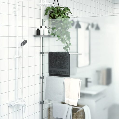 Willst du deine Handtücher zum Trocknen aufhängen, ohne deine Badezimmerwände mit Löchern zu ruinieren? Dann ist dieser Handtuchhalter die perfekte Lösung! Korrosionsbeständiges Material: Aluminium ist ein leichtes und starkes Metall. Es ist dank einer selbstschützenden Oxidschicht korrosionsbeständig. Dieser Handtuchständer aus Aluminium ist so gebaut, dass er jahrelang hält.Platzsparend: Der Handtuchhalter ist eine großartige Lösung für die Aufbewahrung von Handtüchern in einem kleineren Bad. Mit 3 stabilen Handtuchstangen ausgestattet, hilft der freistehende Handtuchständer, den vertikalen Raum optimal zu nutzen. So können Handtücher, Waschlappen und mehr aufgehängt werden, ohne viel Platz einzunehmen.Flexibles Design: Die Handtuchstangen sind verstellbar und der Handtuchhalter Höhe kann auf bis zu 2,8 Meter erweitert werden, um deinen unterschiedlichen Bedürfnissen gerecht zu werden.Vielseitig einsetzbar: Dieser Handtuchhalter hält nicht nur dein Handtuch, sondern eignet sich auch zum Aufhängen von Schmuck. ** Farbe: Silbern ** Material: Aluminium ** Größe: 47 x 280 cm (B x H) ** Durchmesser der Handtuchstangen (je): 18 mm ** Ausziehbar bis zu einer maximalen Höhe von 2,8 m ** Zusammenbau erforderlich: Ja