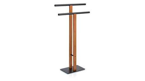 Handtuchhalter aus schwarzem Metall und eingefärbtem Bambus. Die Kombination aus dem modernen, matten Finish des Metalls und der natürlichen Schönheit des Bambus sorgt für einen stilvollen Akzent, der perfekt in jedes Badezimmer passt. Mit einer Höhe von 93 cm bietet der Handtuchhalter ausreichend Platz, um deine Handtücher ordentlich und immer griffbereit aufzubewahren. Die zwei Handtuchstangen ermöglichen es dir, deine Handtücher auf praktische Weise zu organisieren – für mehr Komfort und Struktur in deinem Bad. Das minimalistische Design sorgt für eine harmonische Integration in jedes Raumkonzept. Der Handtuchhalter ist nicht nur funktional, sondern auch ein echter Blickfang, der die natürliche Schönheit von Bambus mit der modernen Schlichtheit von Metall vereint. Maße ca. 50 x 93 x 20 cm (BxHxT)