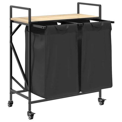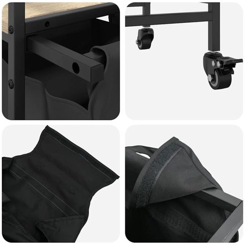 Der Wäschekorb bietet eine geräumige und praktische Aufbewahrungslösung mit ausziehbaren Wäschesäcken und Rollen, die das Ordnen und Transportieren Ihrer Wäsche mühelos machen. Wäschesortierer: Dieser Wäschesortierer bietet Platz für eine großzügige Wäscheladung pro Wäschesack und hilft, Kleidungsstücke nach Farbe oder Stoffart zu sortieren, für einen aufgeräumten Wäschebereich zu sorgen und auch Spielzeug und mehr aufzubewahren.Praktische ausziehbare Wäschesäcke: Die herausnehmbaren Wäschesäcke sind mit ausziehbaren Griffen und Klettverschlüssen zum einfachen Abnehmen und Herausziehen ausgestattet. Die verstärkten Bodenplatten helfen, die Form der Säcke zu erhalten und ein Durchhängen zu verhindern.Robuste und langlebige Struktur: Dieser Wäschekorb kombiniert einen Stahlrahmen mit langlebigem Holzwerkstoff und bietet so hervorragende Festigkeit, Verschleißfestigkeit und Stabilität.Obere Ablagefläche: Der Wäschekorb verfügt über ein oberes Regal und bietet so eine praktische Lösung, um Ihre wichtigsten Dinge griffbereit zu haben. Perfekt zur Aufbewahrung von Toilettenartikeln, Waschmitteln, Weichspülern oder sogar Dekorationsartikeln.Mühelose Mobilität: Dank robuster Räder lässt sich dieser Wäschekorb problemlos von Raum zu Raum rollen. Zwei der Räder sind mit Bremsen ausgestattet, sodass der Korb, sobald Sie ihn an der gewünschten Stelle platziert haben, sicher an seinem Platz bleibt und nicht wegrollt. ** Rahmenfarbe: Schwarz ** Regalfarbe: Sonoma-Eiche ** Wäschesackfarbe: Schwarz ** Rahmenmaterial: Stahl ** Regalmaterial: Holzwerkstoff ** Wäschesackmaterial: Stoff (100 % Polyester) ** Gesamtmaße: 67 x 33 x 82 cm (B x T x H) ** Maße Wäschesack (jeweils): 29,5 x 29,5 x 52,5 cm (B x T x H) ** Maximale Gesamttragkraft: 40 kg ** Max. Tragkraft pro Regal: 20 kg ** Max. Tragkraft pro Wäschesack: 5 kg ** Mit vier Rädern (zwei mit Bremsen) ** Jeder Wäschesack verfügt über eine Bodenplatte für mehr Stabilität ** Zusammenbau erforderlich: Ja ** Lieferumfang: ** 2 x Wäschesack ** 2 x Bodenplatte ** 1 x Regal ** 4 x Räder ** Wäschekorbgestell ** Montagezubehör