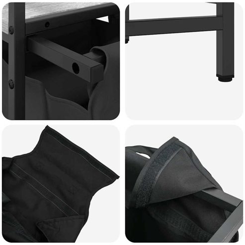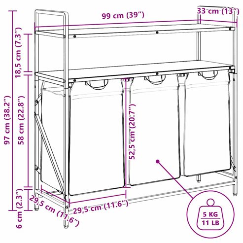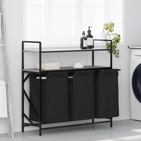 Der Wäschekorb bietet eine geräumige und praktische Aufbewahrungslösung mit herausziehbaren Beuteln, die das Ordnen Ihrer Wäsche mühelos machen. Wäschesortierer: Dieser Organizer bietet Platz für eine großzügige Wäscheladung pro Beutel und hilft dabei, Kleidungsstücke nach Farbe oder Stoffart zu sortieren, einen aufgeräumten Wäschebereich zu erhalten und auch Spielzeug und mehr aufzubewahren.Praktische herausziehbare Wäschebeutel: Die herausnehmbaren Wäschebeutel sind mit ausziehbaren Griffen und Klettverschlüssen zum einfachen Abnehmen und Herausziehen ausgestattet. Die verstärkten Bodenplatten helfen, die Form der Beutel zu erhalten und ein Durchhängen zu verhindern.Robuste und langlebige Struktur: Dieser Wäschekorb kombiniert einen Stahlrahmen mit langlebigem Holzwerkstoff und bietet so hervorragende Festigkeit, Verschleißfestigkeit und Stabilität.Obere Ablagefläche: Der Wäschekorb verfügt über zusätzliche Ablagen und bietet so eine praktische Lösung, um Ihre wichtigsten Dinge griffbereit zu haben. Perfekt zur Aufbewahrung von Toilettenartikeln, Waschmitteln, Weichspülern oder sogar Dekorationsartikeln.Vielseitig und multifunktional: Dieses Regal ist perfekt für die Waschküche, das Badezimmer oder das Schlafzimmer geeignet und verbindet nahtlos Funktionalität mit Stil. So bleibt Ihr Zuhause ordentlich und organisiert und passt gleichzeitig zu verschiedenen Einrichtungsstilen. Warnung:Um ein Umkippen zu verhindern, muss dieses Produkt mit der mitgelieferten Wandhalterung verwendet werden. ** Rahmenfarbe: Schwarz ** Regalfarbe: Sonoma-Grau ** Wäschesackfarbe: Schwarz ** Rahmenmaterial: Stahl ** Regalmaterial: Holzwerkstoff ** Wäschesackmaterial: Stoff (100 % Polyester) ** Gesamtmaße: 99 x 33 x 97 cm (B x T x H) ** Wäschesackmaße (jeweils): 29,5 x 29,5 x 52,5 cm (B x T x H) ** Maximale Gesamttragkraft: 40 kg ** Max. Tragkraft pro Regal: 20 kg ** Max. Tragkraft pro Wäschesack: 5 kg ** Jeder Wäschesack verfügt über eine Bodenplatte zur Stabilisierung ** Montage erforderlich: Ja ** Lieferumfang: ** 3 x Wäschesack ** 3 x Bodenplatte ** 2 x Regal ** Wäschekorbrahmen ** Montagezubehör