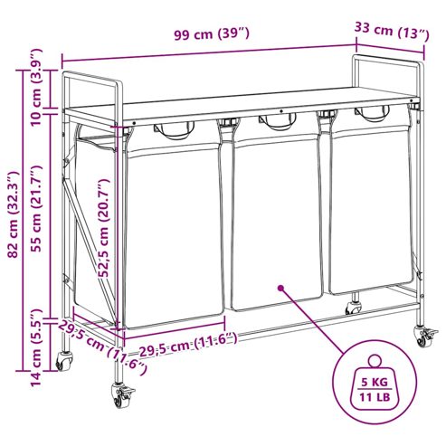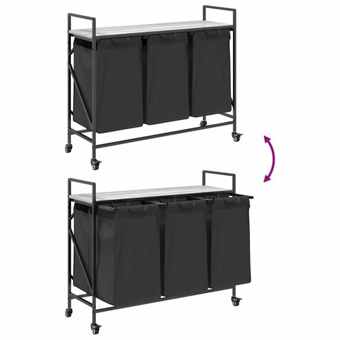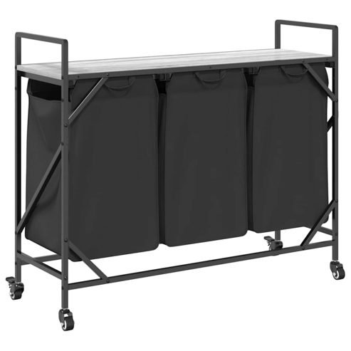 Der Wäschekorb bietet eine geräumige und praktische Aufbewahrungslösung mit ausziehbaren Wäschesäcken und Rollen, die das Ordnen und Transportieren Ihrer Wäsche mühelos machen. Wäschesortierer: Dieser Wäschesortierer bietet Platz für eine großzügige Wäscheladung pro Wäschesack und hilft, Kleidungsstücke nach Farbe oder Stoffart zu sortieren, für einen aufgeräumten Wäschebereich zu sorgen und auch Spielzeug und mehr aufzubewahren.Praktische ausziehbare Wäschesäcke: Die herausnehmbaren Wäschesäcke sind mit ausziehbaren Griffen und Klettverschlüssen zum einfachen Abnehmen und Herausziehen ausgestattet. Die verstärkten Bodenplatten helfen, die Form der Säcke zu erhalten und ein Durchhängen zu verhindern.Robuste und langlebige Struktur: Dieser Wäschekorb kombiniert einen Stahlrahmen mit langlebigem Holzwerkstoff und bietet so hervorragende Festigkeit, Verschleißfestigkeit und Stabilität.Obere Ablagefläche: Der Wäschekorb verfügt über ein oberes Regal und bietet so eine praktische Lösung, um Ihre wichtigsten Dinge griffbereit zu haben. Perfekt zur Aufbewahrung von Toilettenartikeln, Waschmitteln, Weichspülern oder sogar Dekorationsartikeln.Mühelose Mobilität: Dank robuster Räder lässt sich dieser Wäschekorb problemlos von Raum zu Raum rollen. Zwei der Räder sind mit Bremsen ausgestattet, sodass der Korb, sobald Sie ihn an der gewünschten Stelle platziert haben, sicher an seinem Platz bleibt und nicht wegrollt. ** Rahmenfarbe: Schwarz ** Regalfarbe: Sonoma-Grau ** Wäschesackfarbe: Schwarz ** Rahmenmaterial: Stahl ** Regalmaterial: Holzwerkstoff ** Wäschesackmaterial: Stoff (100 % Polyester) ** Gesamtmaße: 99 x 33 x 82 cm (B x T x H) ** Wäschesackmaße (jeweils): 29,5 x 29,5 x 52,5 cm (B x T x H) ** Maximale Gesamttragkraft: 40 kg ** Max. Tragkraft pro Regal: 20 kg ** Max. Tragkraft pro Wäschesack: 5 kg ** Mit vier Rädern (zwei mit Bremsen) ** Jeder Wäschesack verfügt über eine Bodenplatte für mehr Stabilität ** Zusammenbau erforderlich: Ja ** Lieferumfang: ** 3 x Wäschesack ** 3 x Bodenplatte ** 1 x Regal ** 4 x Räder ** Wäschekorbgestell ** Montagezubehör